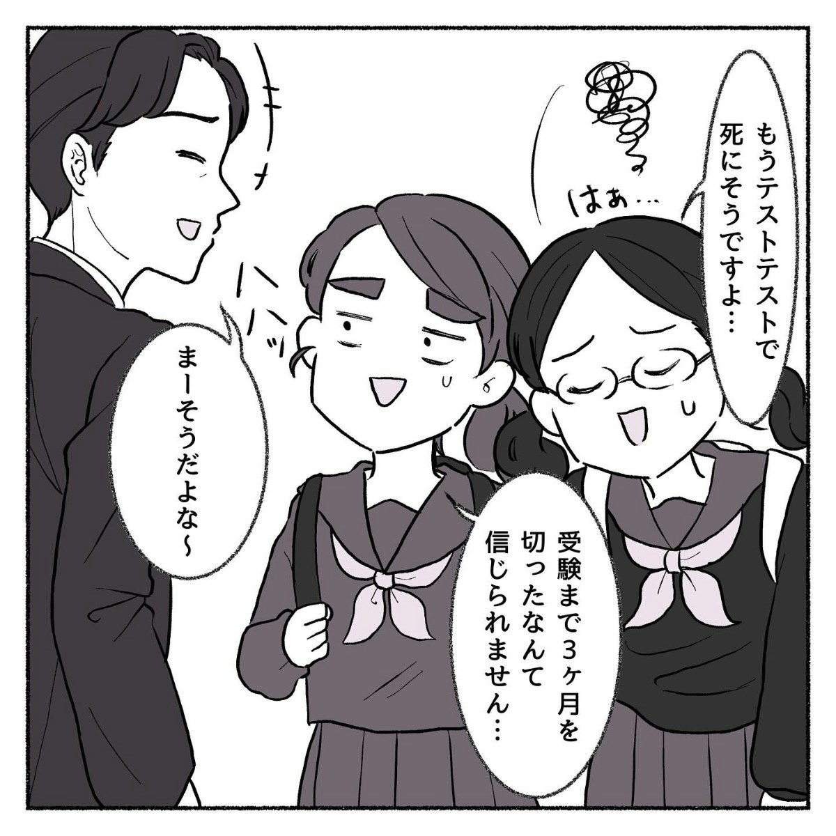 りったさんと親友がK先生の話で盛り上がっていると、そこへK先生本人がやって来ました。受験まで3か月をきり、りったさんたちは慌ただしい毎日を送っています。