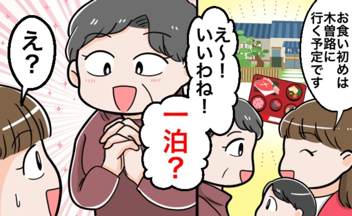 投稿者さんは、お子さんのお食い初めについて「木曽路」というお店に行く予定と伝えたところ、長野県にある木曽路という地名と勘違いをしたそう。「え〜!いいね!一泊?」というやりとりから、関係性の良さが伝わってきますね。