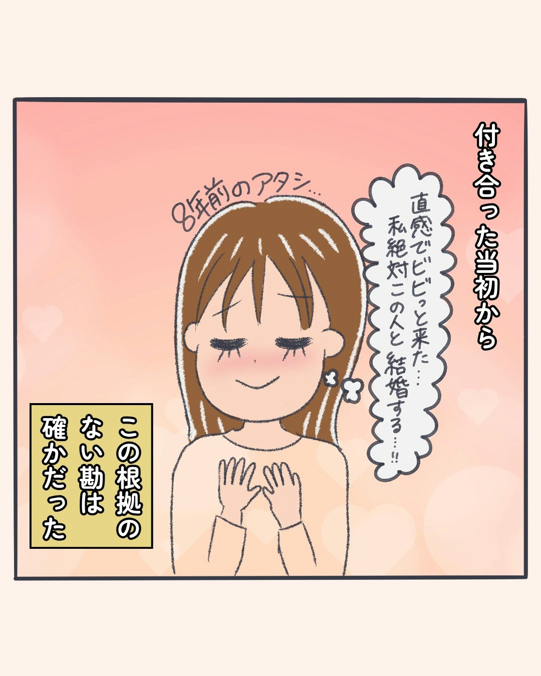主人公夫婦はとても仲良し。今の夫と出会った瞬間からこの人と結婚すると思うほど根拠のない勘で満ち溢れていたといいます。