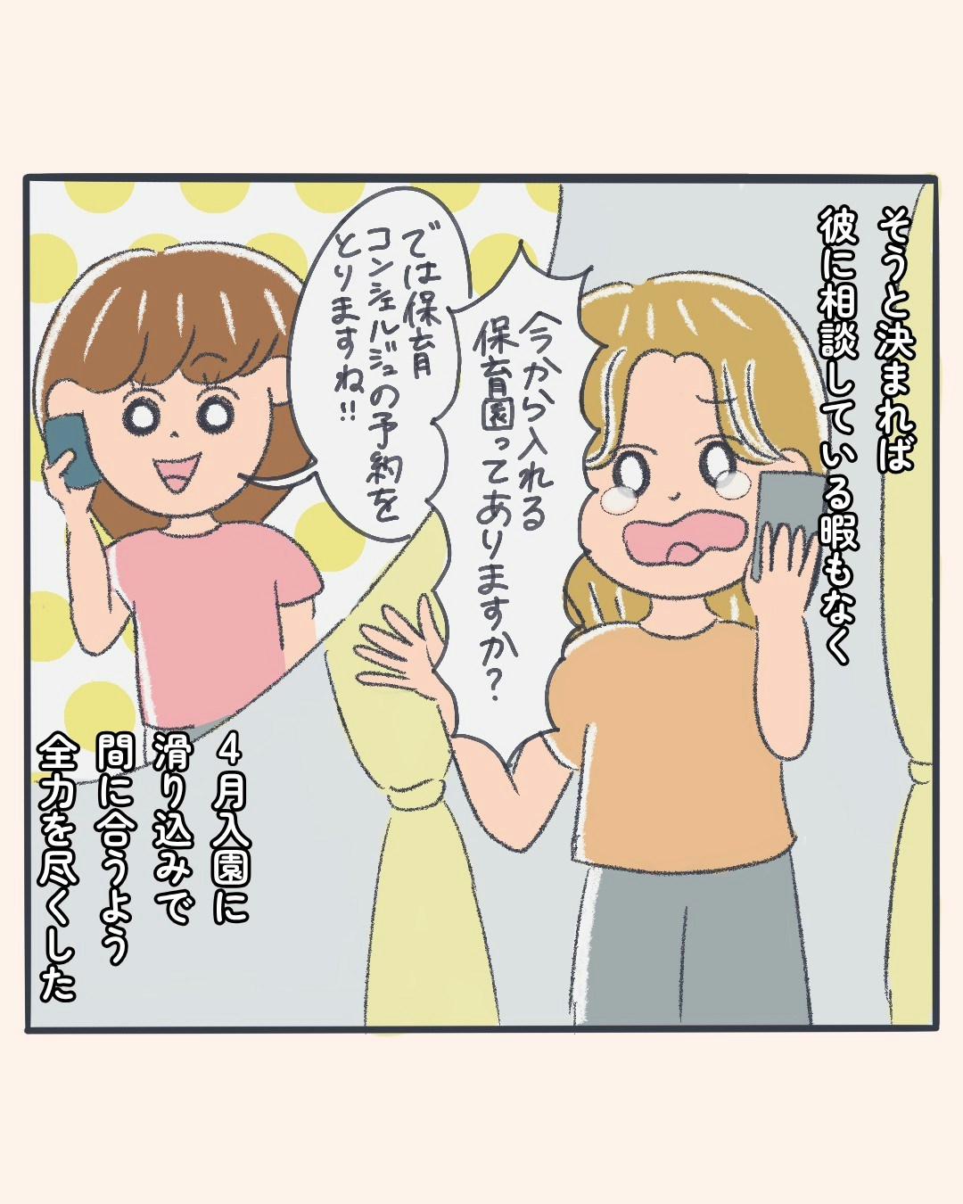 夫の言葉に動揺した主人公でしたが、いつまでも立ち止まってはいられません。4月の入園に間に合うよう、保育園探しを必死に進めなくてはなりませんでした。