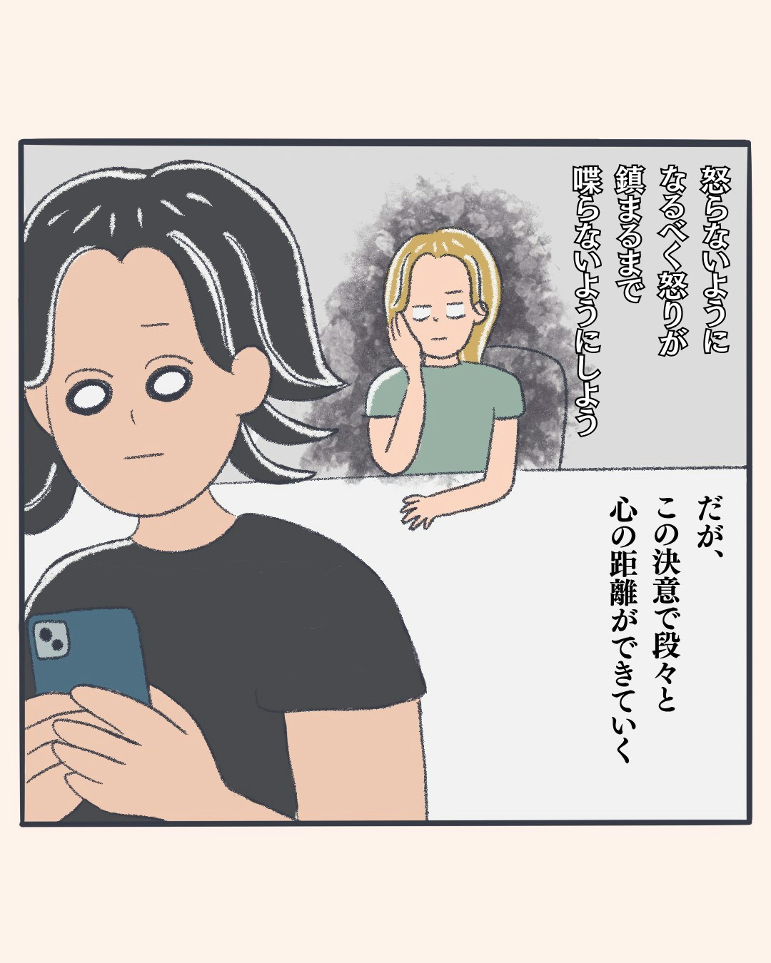 怒りが収まらず夫と話す気にもなれない主人公。息子の生活リズムを整えるということを口実に8時に就寝する毎日。そんな日々を過ごしていると、夫との間にどんどん心の距離ができてきてしまいます。このまま沈黙を続けていいのだろうか。どうすればいいのでしょうか。