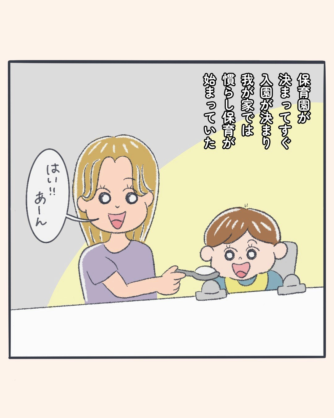 息子は無事決まった保育園で慣らし保育が始まりました。生活リズムを整えるため、8時には寝るので夫と会わない生活に。主人公の怒りは収まりそうにもなく怒りが静まるまでは夫と話さないことに決意したようです。