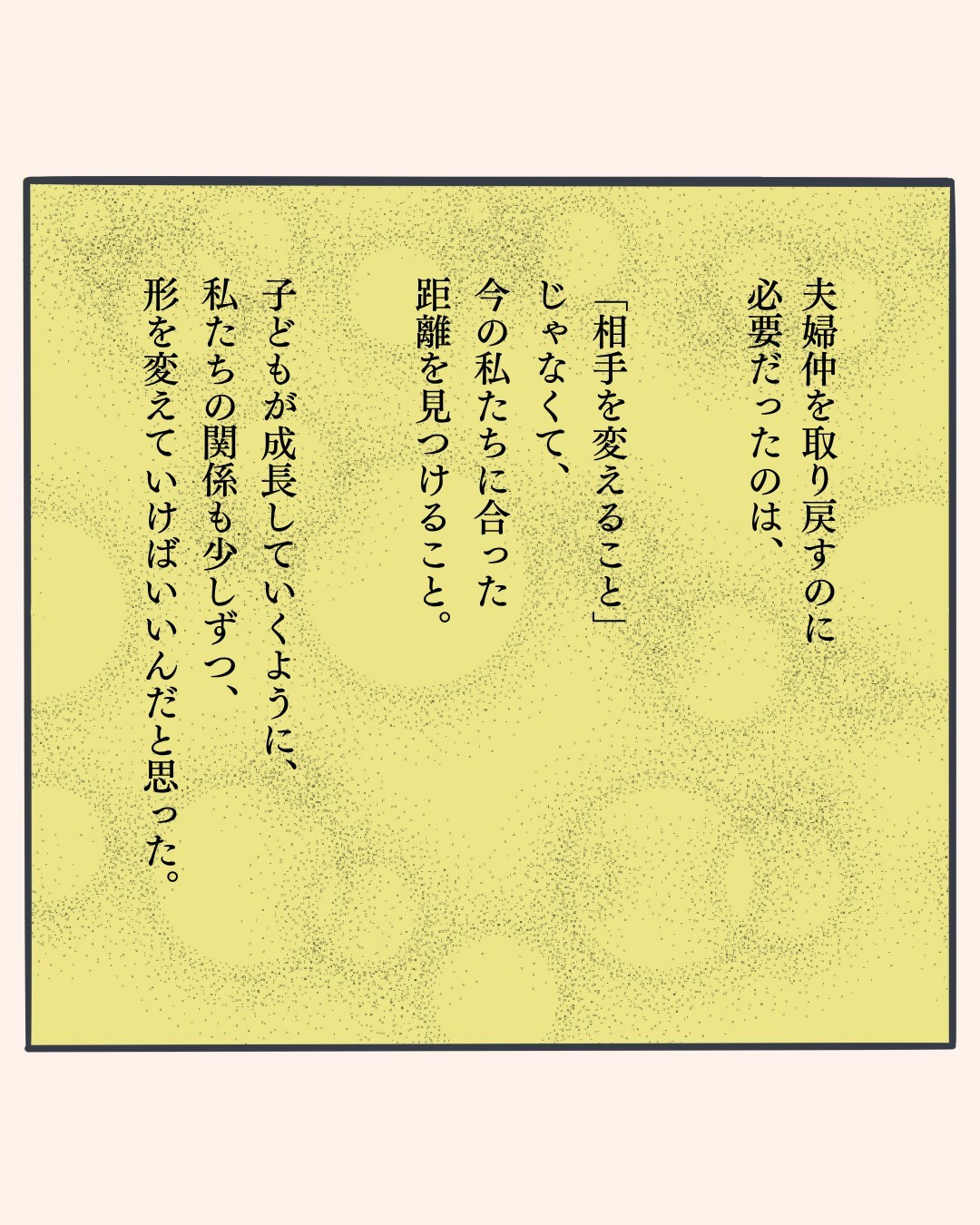 その沈黙はやがて夫婦の間に壁をつくり、関係は冷え込んでいきます。「このままでは子どもに影響してしまう」と気づいた主人公は、勇気を出して夫婦関係の修復に取り組み始めました。夫婦仲改善のためには、「相手を変えること」ではなく、「自分たちにあった距離感をみつけること」「伝え方」にあったのだと気づいたようです。