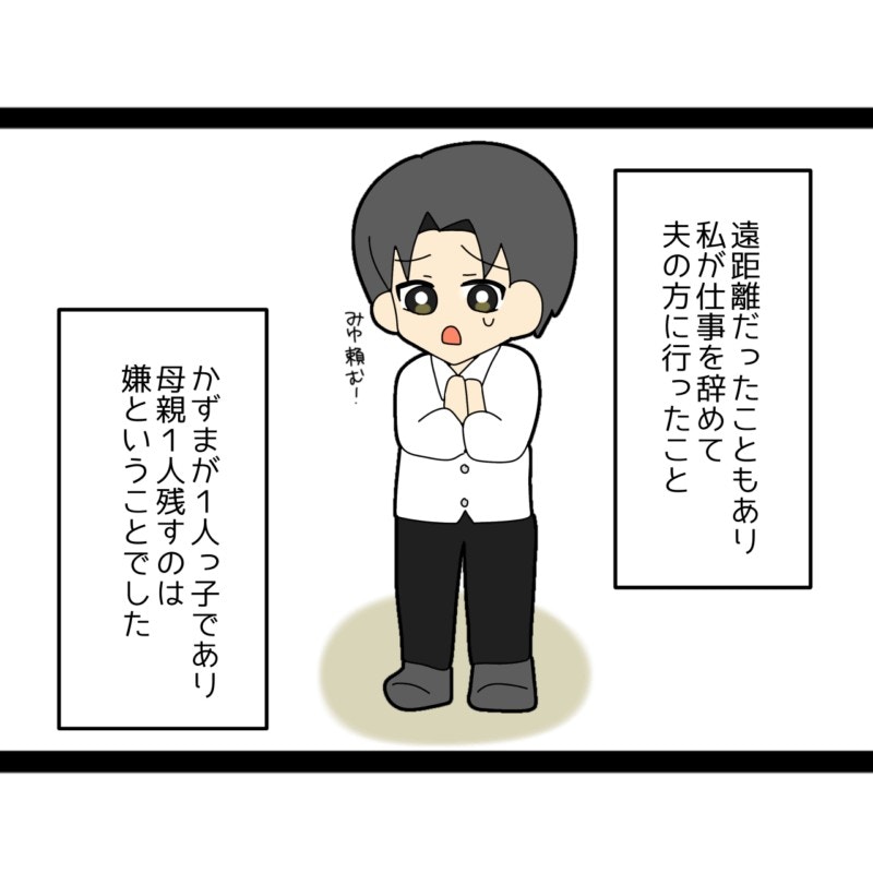 夫・かずまさんは一人っ子で、母をひとり残したくないという思いから、みゆさんに同居を提案しました。みゆさんには妹がおり、自分の実家のことは妹に任せられるため、かずまさんの頼みを受け入れることにしたのです。