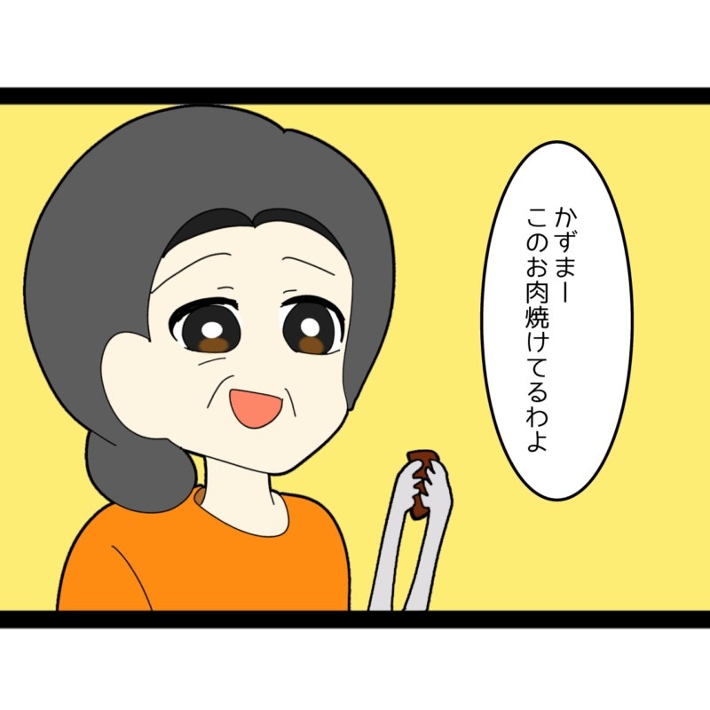 息子のために肉を焼く義母。それを当たり前のように食べるかずまさん。