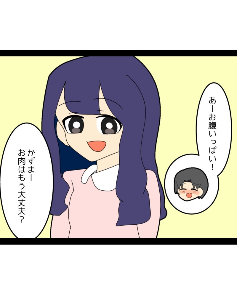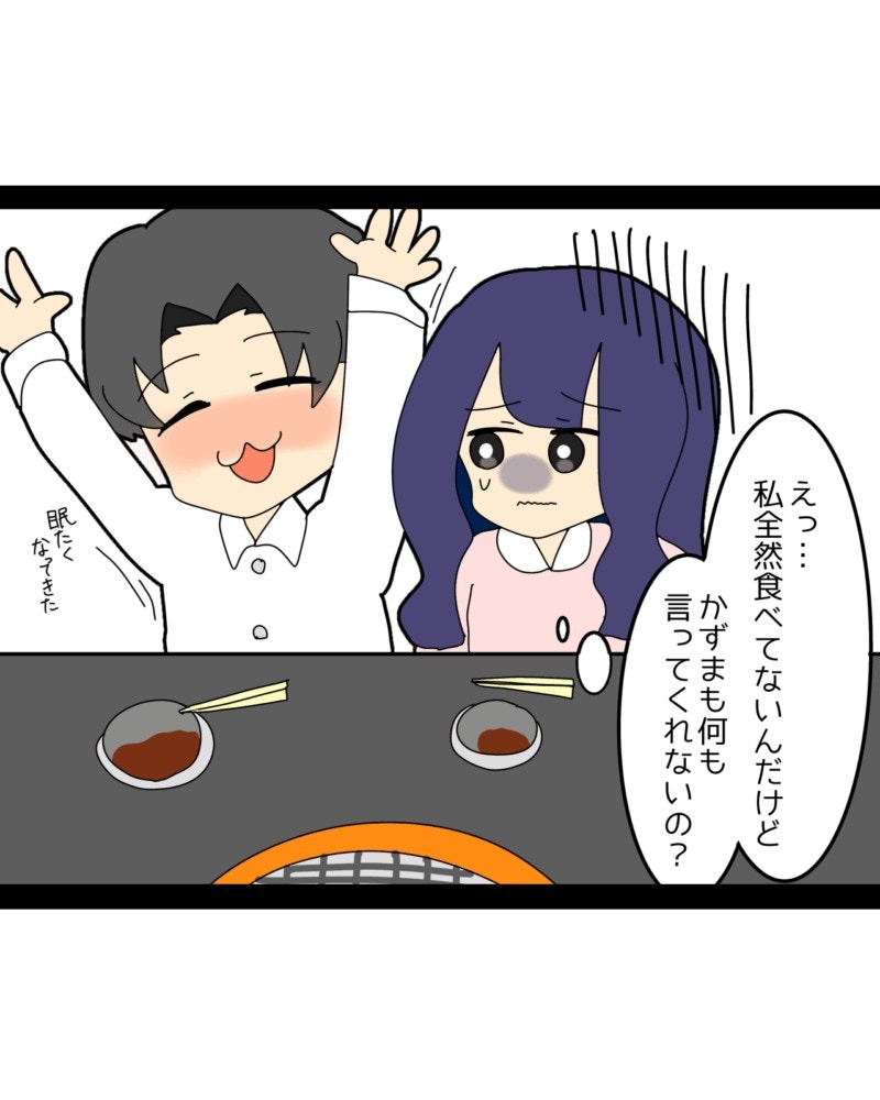 ビールも飲んで大満足な夫かずまさん。みゆさんが嫌な思いをしていることにも全く気付いていません。かずまさんがおなかいっぱいになったと言うことは、やっとみゆさんもお肉を食べるチャンスが…。