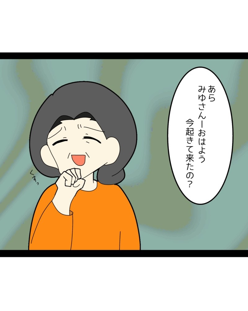 昨晩、焼肉に行き嫌な思いをしましたが、同居して初めての朝を迎えたみゆさん。さっそく義母からの嫌味でしょうか。