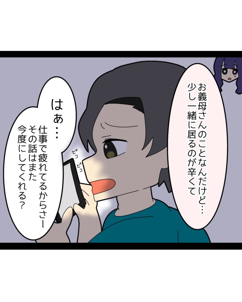 ある日、思い切って夫に義母のことで相談しようと声をかけました。しかし返ってきたのは、こちらを見ることもなく「はぁ…」という深いため息。まるで「その話か」と言わんばかりの、めんどくさそうな反応でした。味方になってほしい相手に突き放された瞬間、みゆさんの胸の中で何かが静かにきしむのでした。