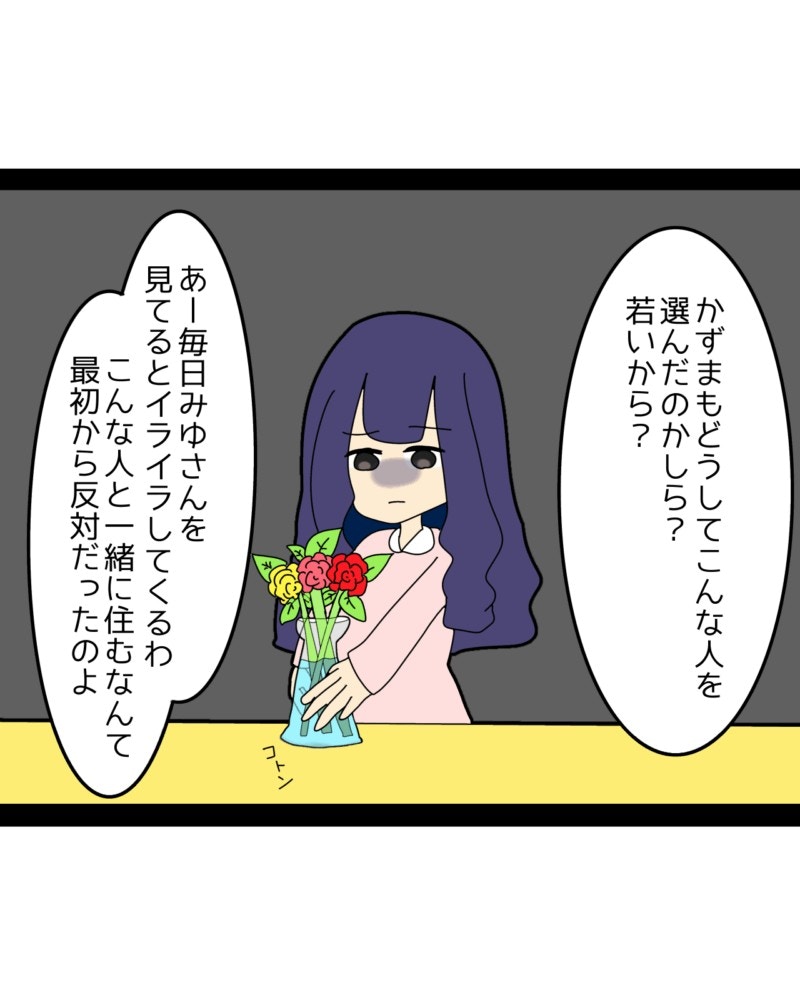 幸せな結婚生活を思い描いていたみゆさんは、夫の実家での暮らしに絶望。義母に愚痴を言われ、いじめられつらい毎日を過ごすのでした。そのつらさを夫・かずまさんに伝えても受け止めてもらえず、義母に強く影響されている姿に、みゆさんは孤独を深めてしまいます。