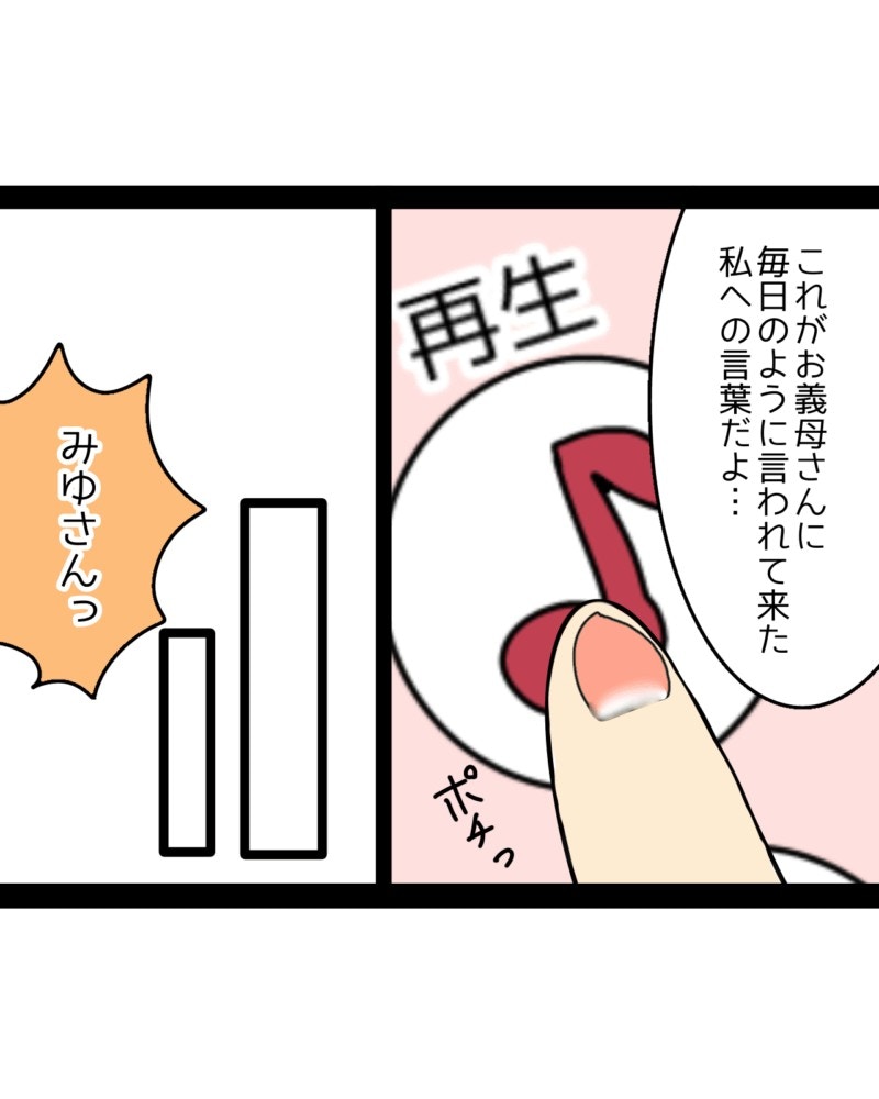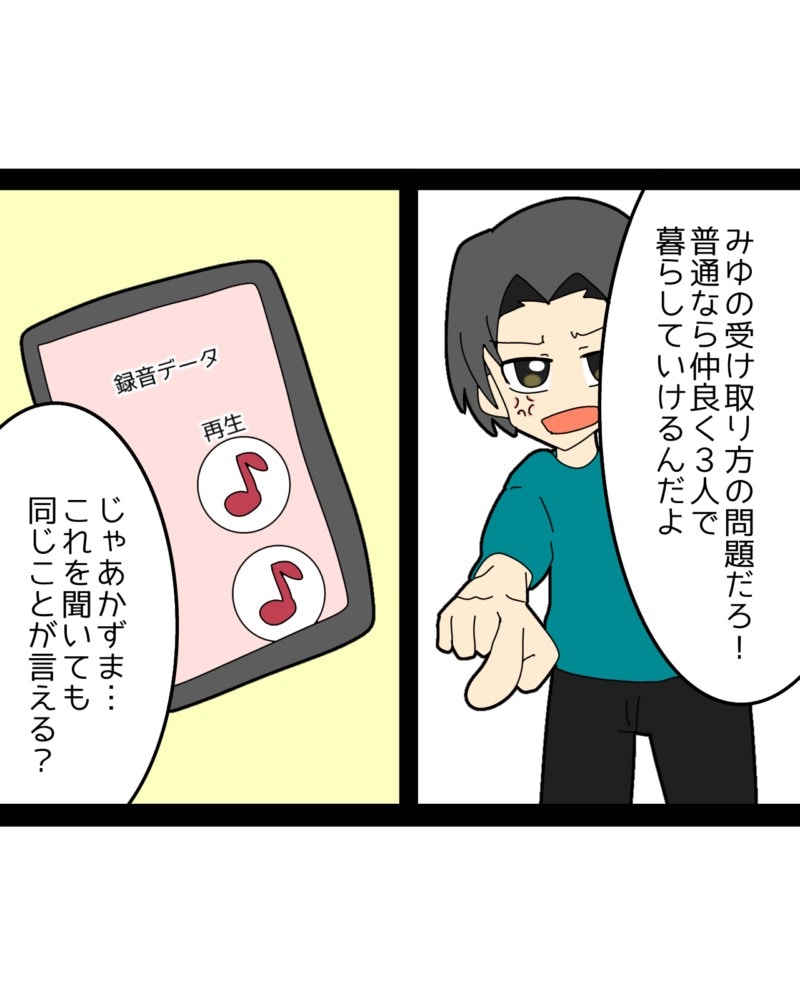 みゆさんが義母のことで相談しても、夫・かずまさんは一方的に「みゆが悪い」と言い張るばかり。そこでみゆさんは、密かに録音していた音源を再生し、かずまさんに聞かせるのでした。