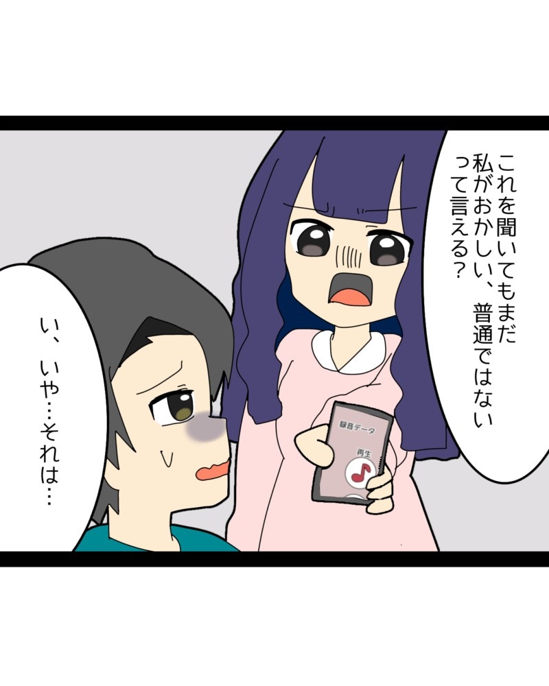 録音した音声を夫・かずまさんに突きつけたみゆさん。「それでもまだ義母の味方をするの?」と問い詰めると、かずまさんは言葉に詰まり、視線を泳がせます。そのとき、騒ぎを聞きつけた義母が、部屋へ入ってくるのでした。
