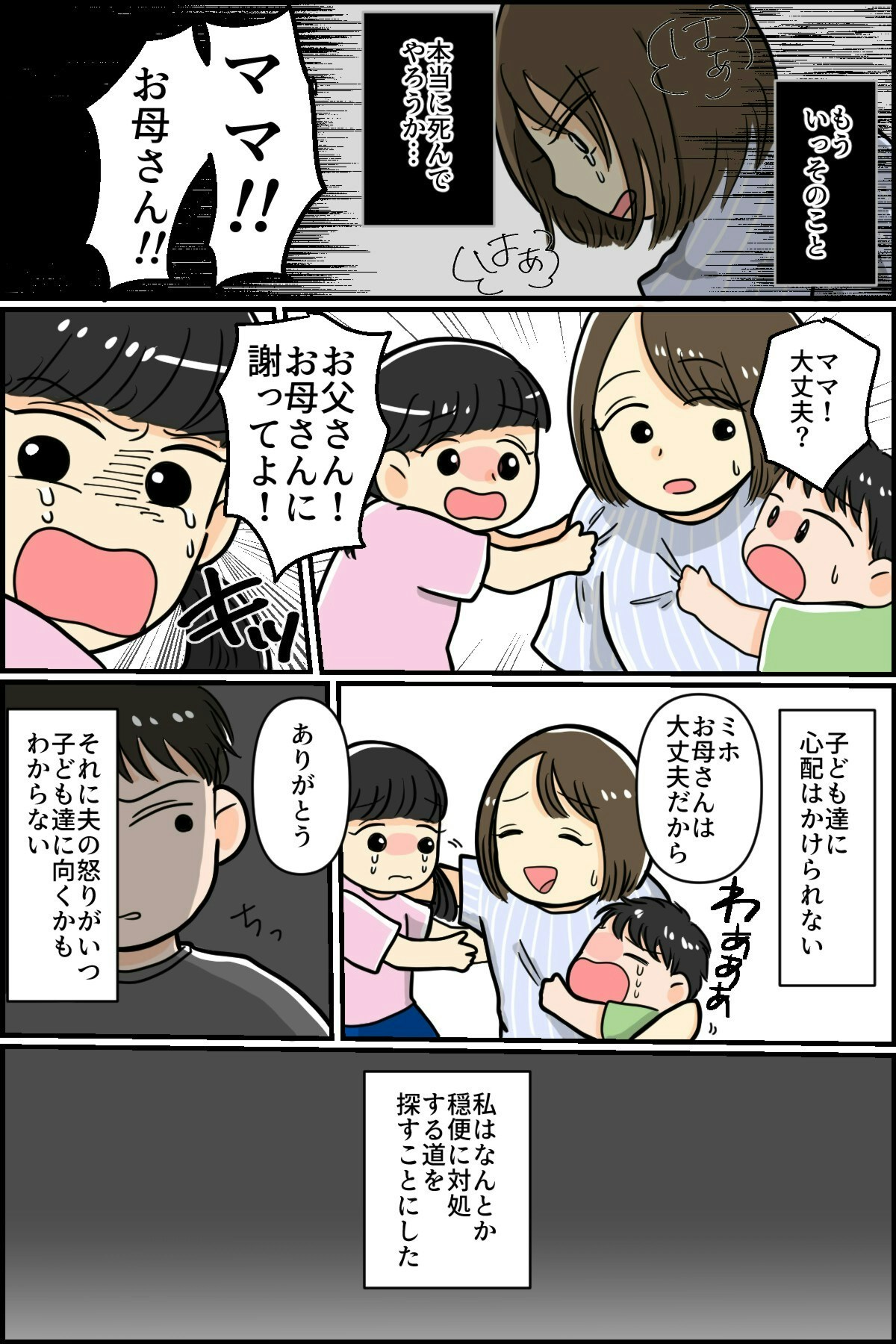 夫の謝罪を受け入れてしまった主人公。あんなにひどい目にあったのに、夫から離れることができませんでした。モラハラ被害者は、感覚がマヒしてしまうのかもしれません。モラハラ加害者から逃げることの難しさが描かれています。