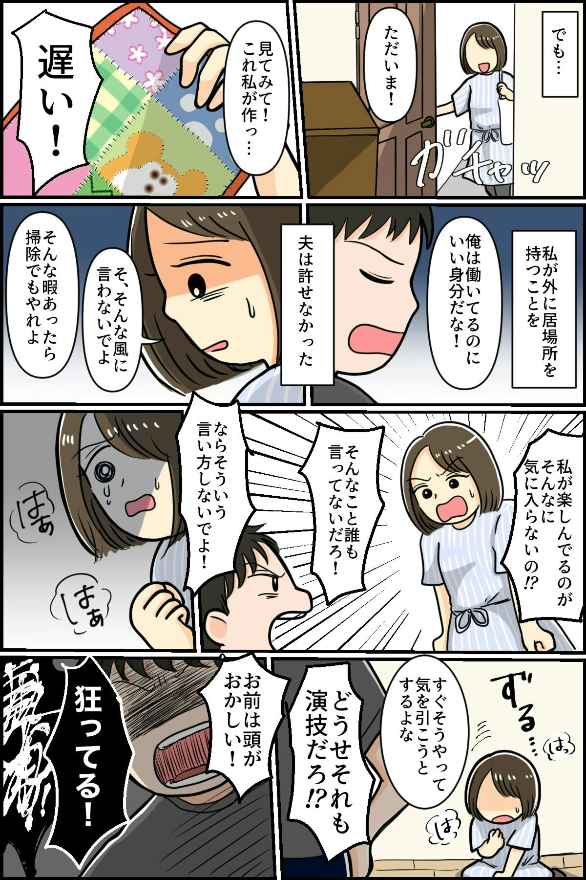 ついに夫から殴られてしまった主人公は、自立に向けて動き出します。経済力をつけて夫を見限る覚悟で仕事を始めたのです。しかし、夫は経済的に自立し始めた妻に不安を感じ、人が変わったかのように今までの行いを謝ったのでした。