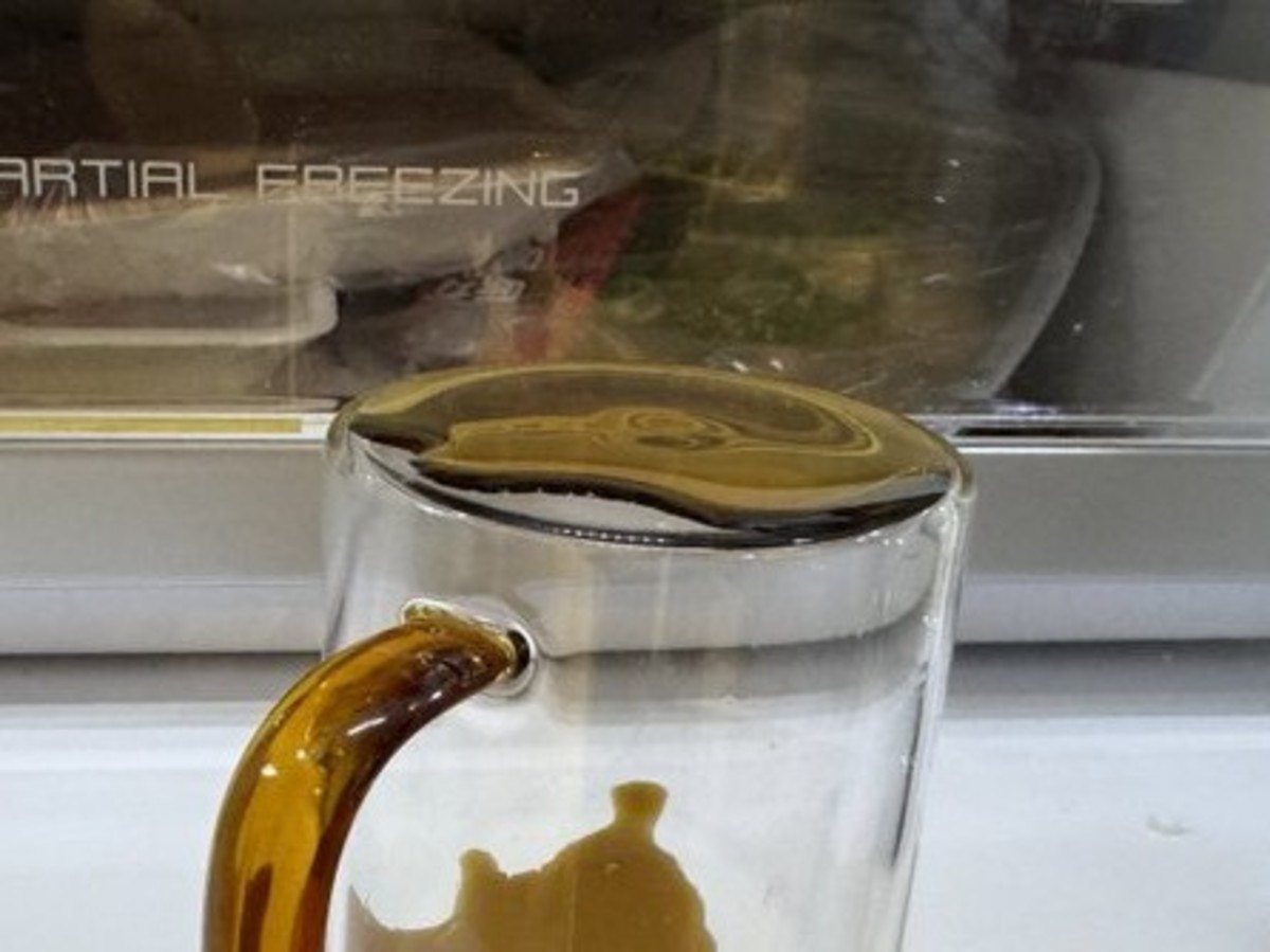 写真には、逆さに置かれたコップの底に広がるコーヒーの姿。きっと、手がコップの向きまで気にかけられないほどのバタバタっぷりだったのでしょう。