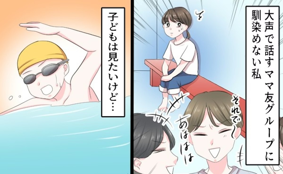 ママ友グループに巻き込まれると、周りに気を遣って、子どもの見学を満足にできない可能性があります。このコメントの方がいうように、スイミングスクールにはおしゃべりをしに行っているわけではないと割り切り、子どものがんばる姿を見るのに集中するとよいでしょう。
