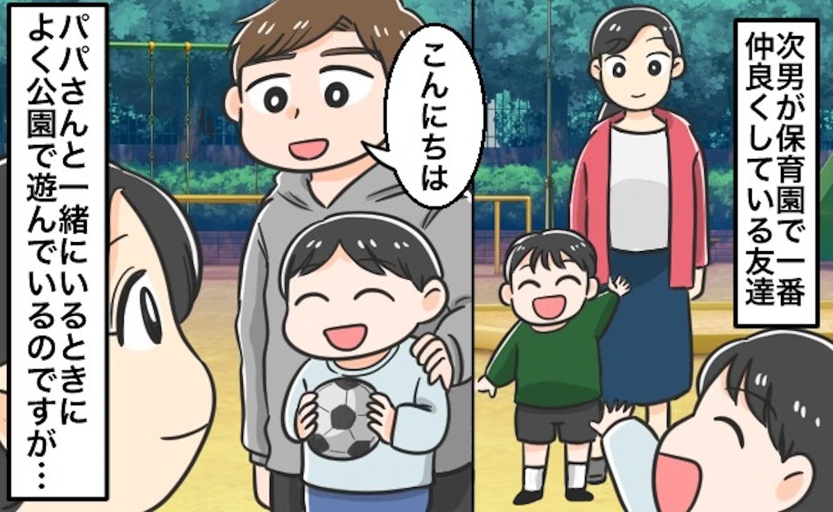 土日は子どもを連れて公園に行く投稿者さん。次男が同じ園に通っている仲よしなkくんと休日に公園で会う機会が多く、一緒に遊んでいるとのこと。kくんを見かけるときはパパと一緒で、ママとは面識が無いようです。