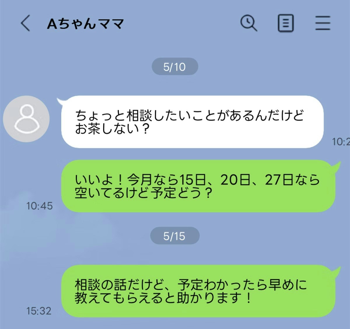 向こうから「〇〇について相談したいんだけどお茶しない?」と、連絡がありました。私は「いいよ!今月なら〇日と〇日と〇日なら空いてるけど予定どう?」と返信しました。