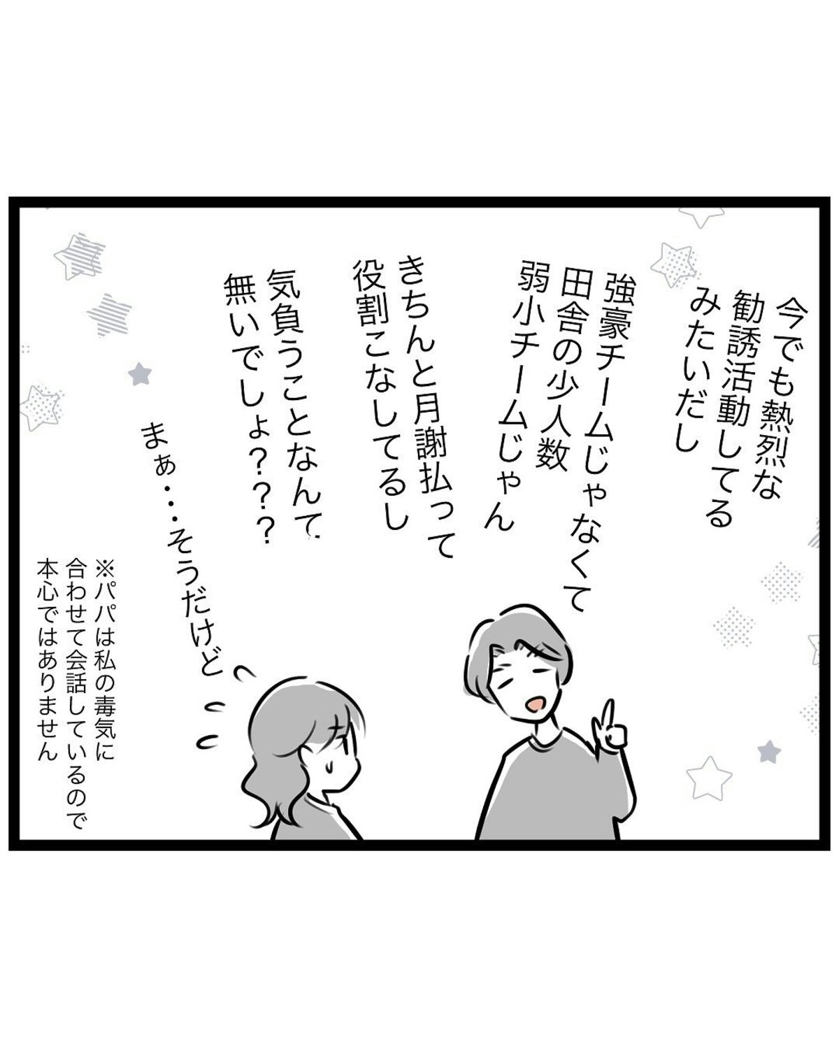 スポ少保護者から仲間はずれにされ、ついに限界を迎えたもっつんさんは「もう辞めさせたい」と夫に本音をこぼしました。これまでもっつんさんが背負ってきた苦労を知った夫は「どうにかする」と寄り添いますが…。