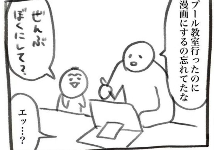 ご紹介するのは、犬犬(@inu_eat_inu)さんの投稿です。育児漫画を描く犬犬さん。ある日、ふと思い出します。「先日のプール教室の話、漫画にしてなかったな…」さっそくペンを走らせようとしたそのとき、横から息子さんが放ったひとことが、面白すぎると話題になっています。
