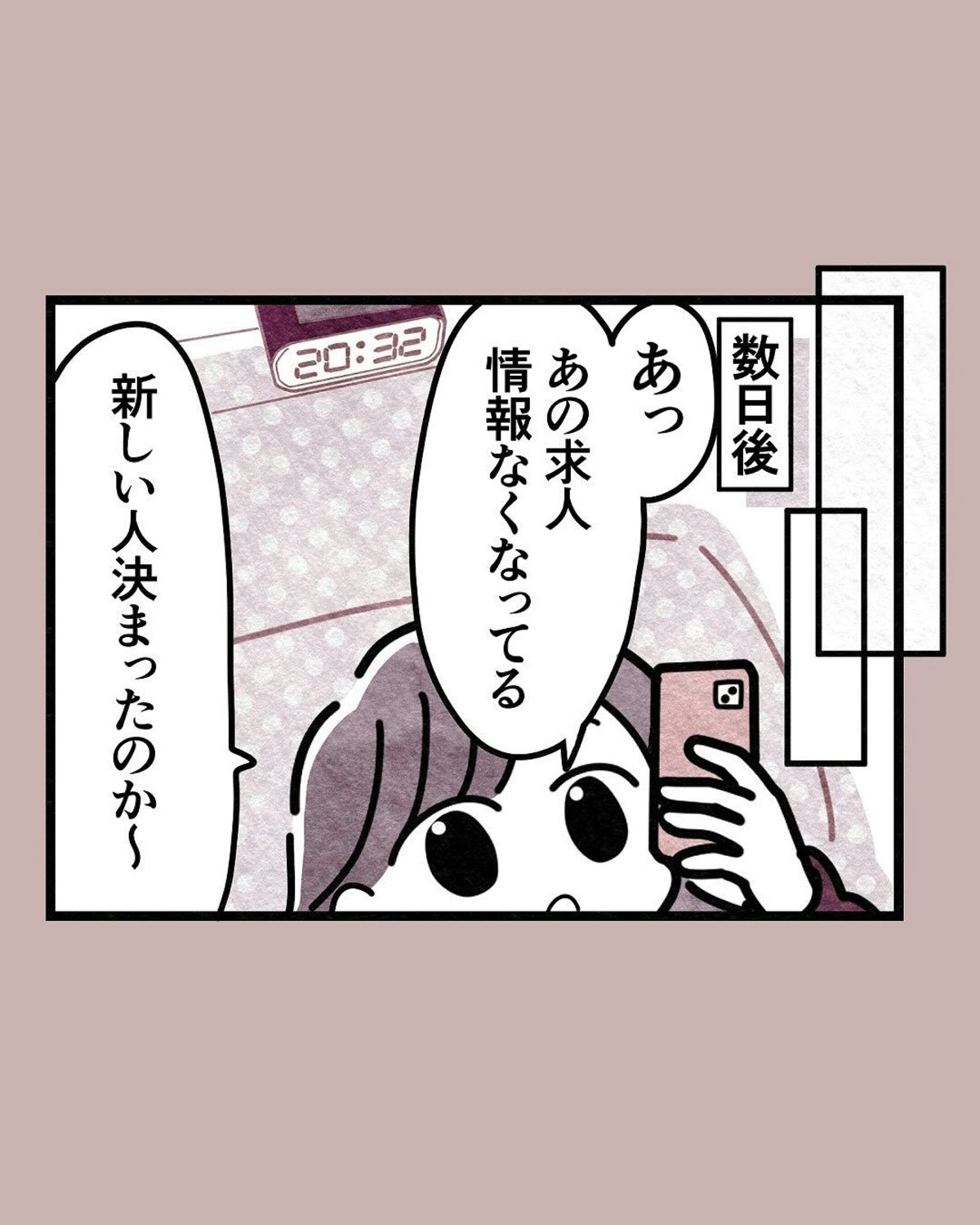 すぐに働けなくても、好条件の求人が気になっていたえみさん。うまってしまうと少し寂しい気持ちになりますね。