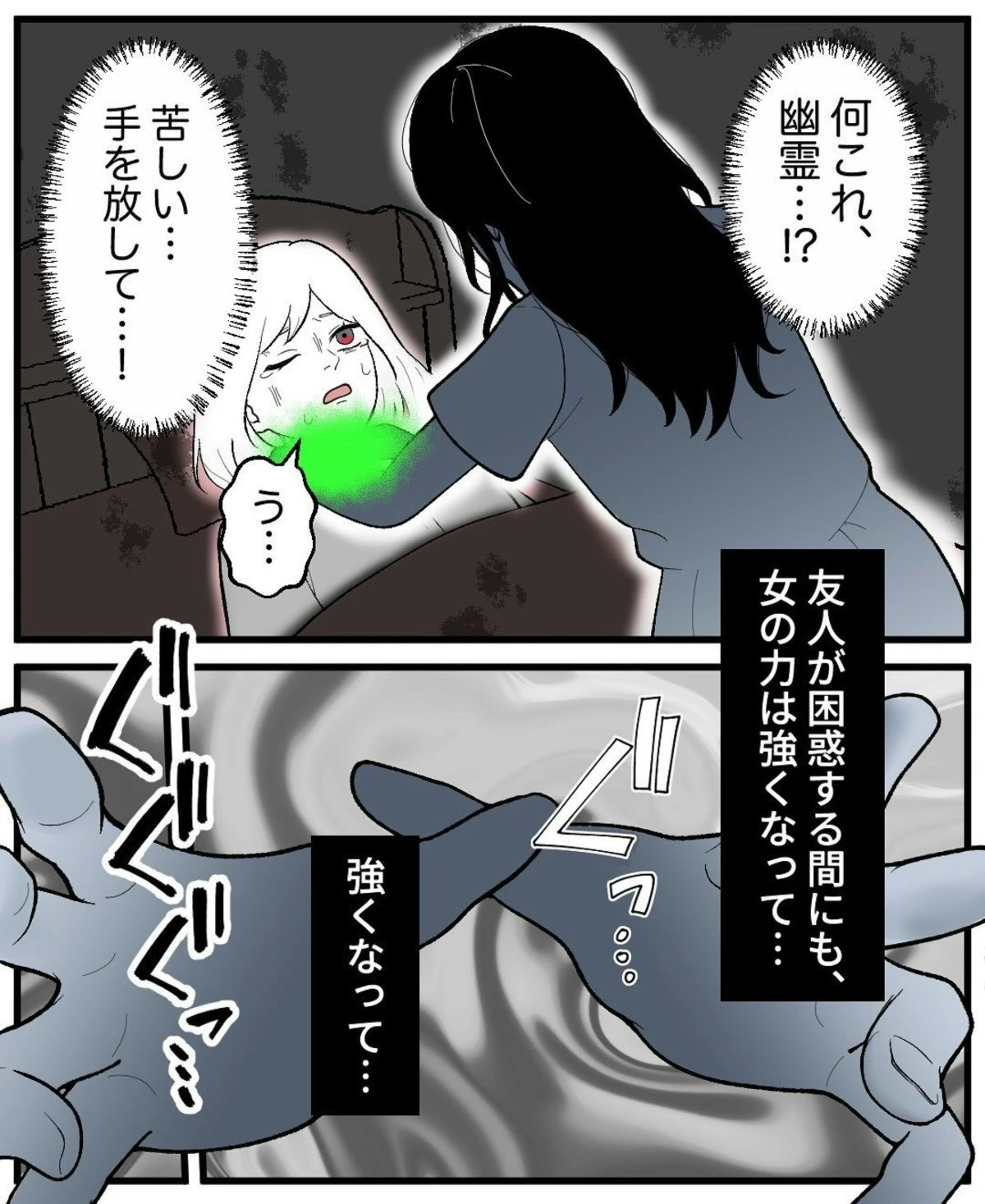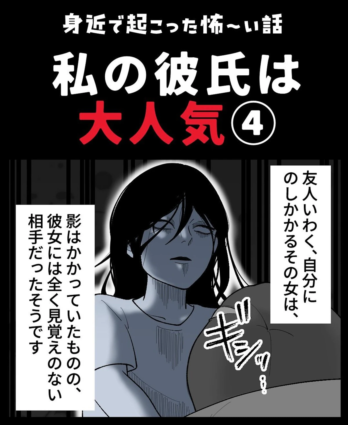 友人の彼氏に女性の手が絡みついているのを視てしまった後日、友人が階段から突き落とされるという事件が起きました。女性に突き落とされたと確信している友人ですが、背後には誰もいなかったのです。ケガを負った友人に彼氏は優しく寄り添ってくれますが、彼氏が帰ったあと寝ようとした友人は幽霊のような女性に首を絞められてしまいます。