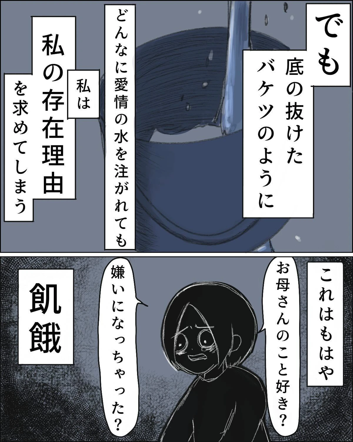 この作品の作者・ねむりひつじさんは、自己肯定感の低さから、不安定になると自己否定が止まらなくなってしまうことに悩んでいました。ある晩、いつも寝かしつけをしていた自分ではなく、息子のみぃくんが「お父さんがいい」と言い出します。その突然のでき事に動揺し、泣いて訴える姿を前に、ねむりひつじさんは一気に自分を責める気持ちに飲み込まれてしまいました。