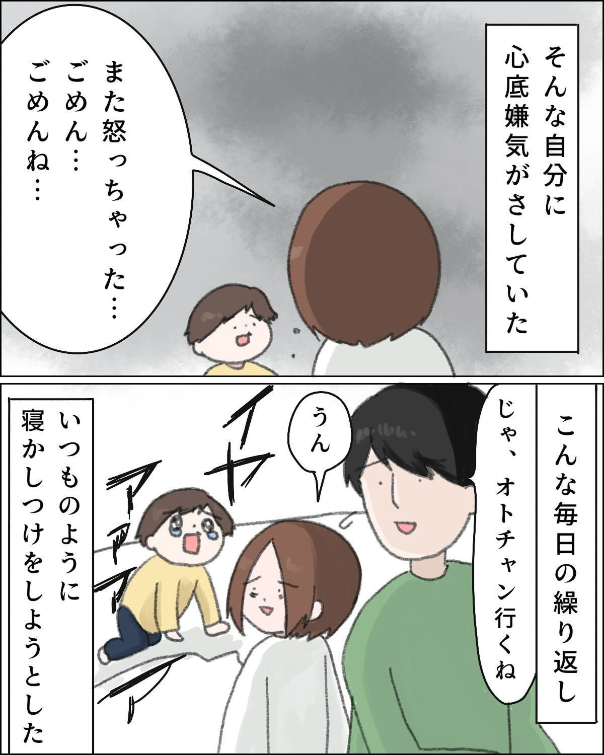 自己肯定感の低さに悩むねむりひつじさんは、マイナス思考の連鎖になり心が不安定になりやすいことに悩んでいました。今回は息子のみぃ君が、初めてお父さんと寝ると言い出したことで、自分の存在を否定するところまで落ち込んでしまうことに。