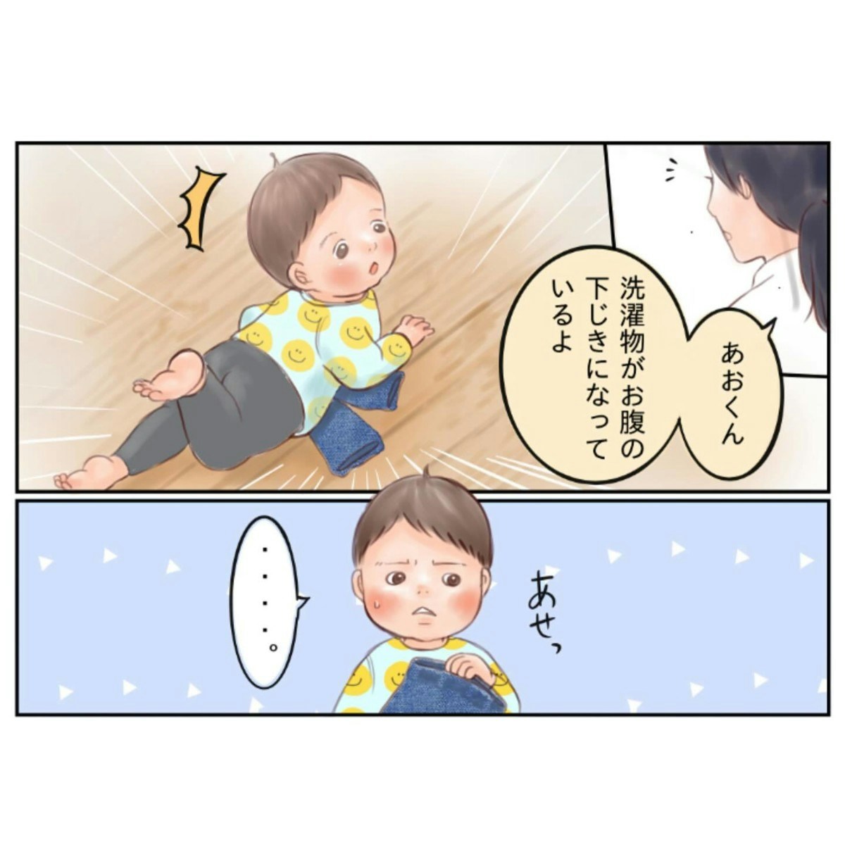 こやま家(@koyama.ke)さんが洗濯物をたたんでいると、見つからない服がひとつ。ママの近くで寝転ぶ息子に目を向けると、おなかの下にその洗濯物が下じきになっていました。それに気付いた息子は気まずそうな顔。そして、まるで洗濯物に気づいていたと言わんばかりのことを言い出します。