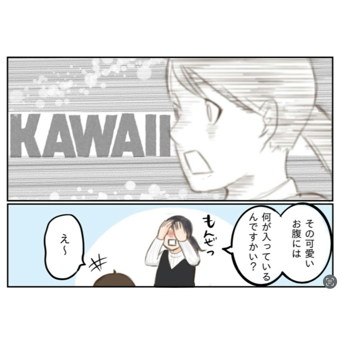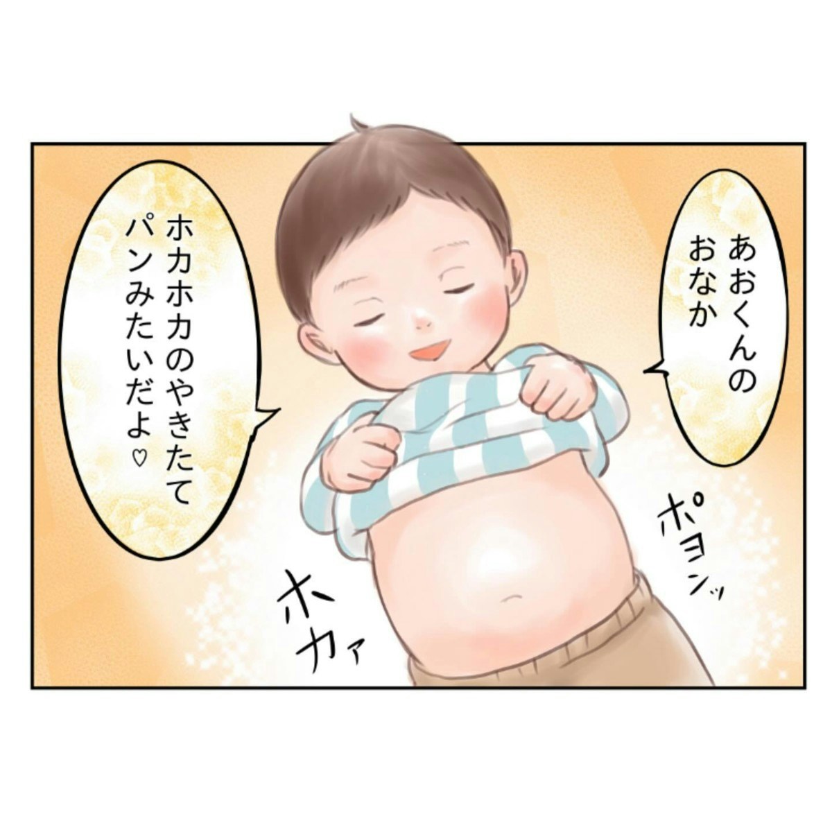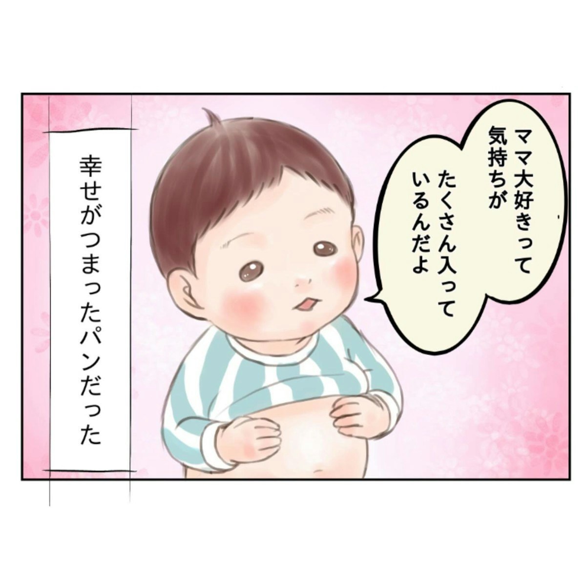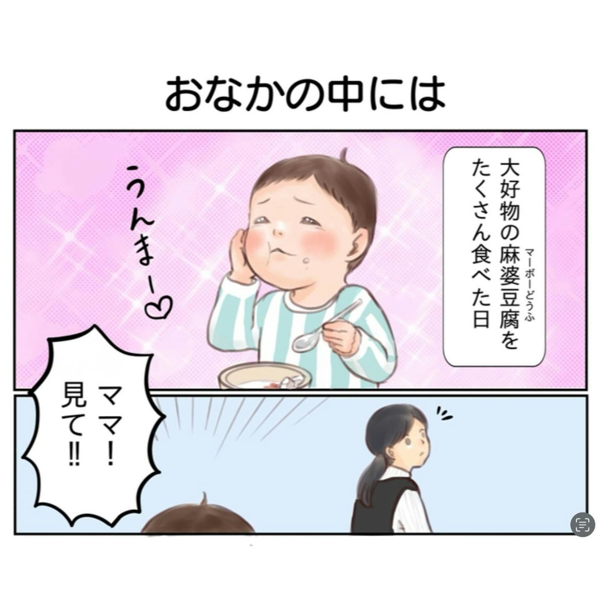 「ママの大好きな気持ち」が入ったパンみたいなおなか、かわいい以外になんて言えばいいのでしょう。麻婆豆腐を食べて、幸せな気持ちになりますね。
