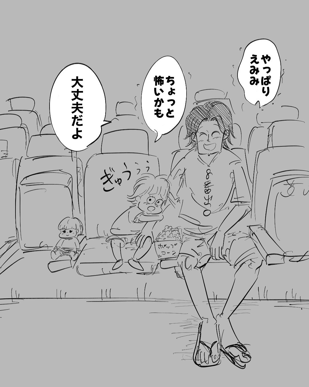 映画の怖いシーンに、一緒に連れてきていた人形の目も覆ってあげる娘。パパは「映画よりいいものを見れた」と喜びで満たされます。娘の可愛らしい行動とパパが娘を見守る眼差しに、心あたたまるエピソードでした。