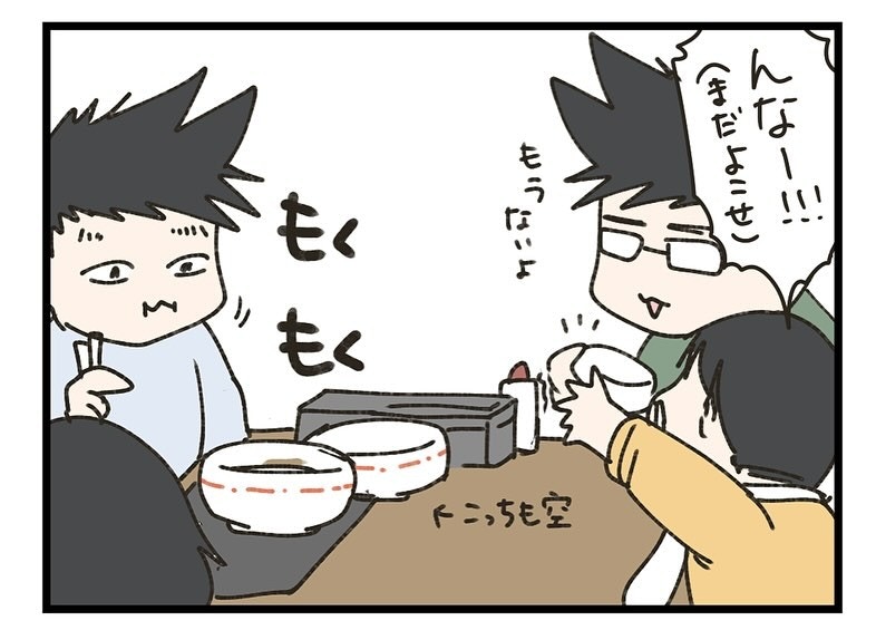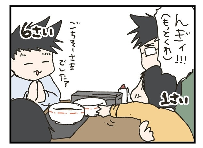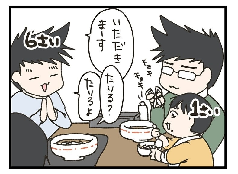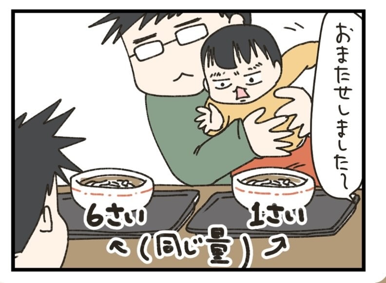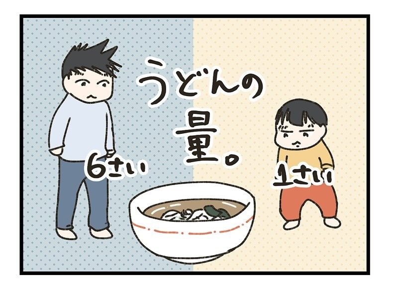 6歳の兄と同じ量のうどんを食べ、「もっと食べたい」と要求する1歳の弟。体重は2倍違うのに、その小さいからだの一体どこに入っているのでしょうか。食事量の個人差は大きいのですね。