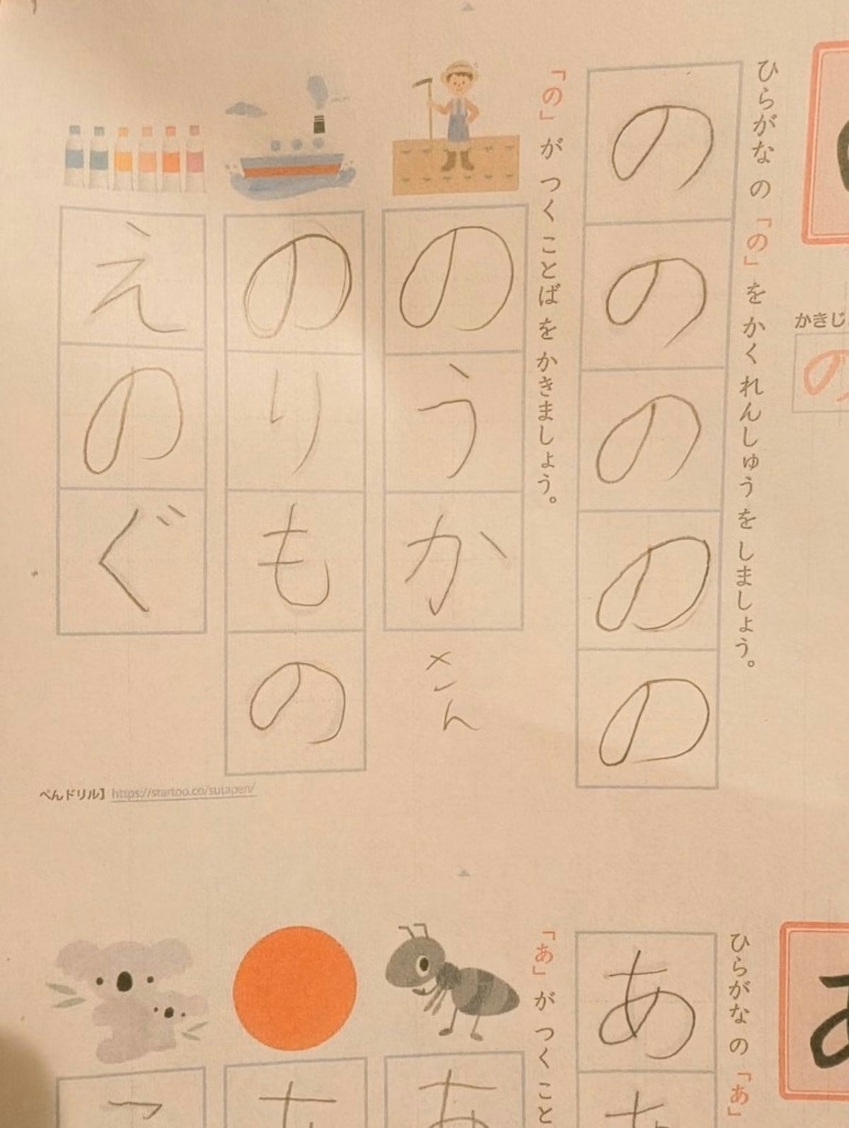 でら(十勝で子育てどうでしょう)(@aerolitkurofune)さんの投稿です。小学1年生の学習で、文字を練習する国語のプリントを一生懸命やった娘さん。「の」の文字をたくさん書いたのですが、そのプリントに付け加えていたある文字が、かわいすぎると話題です。