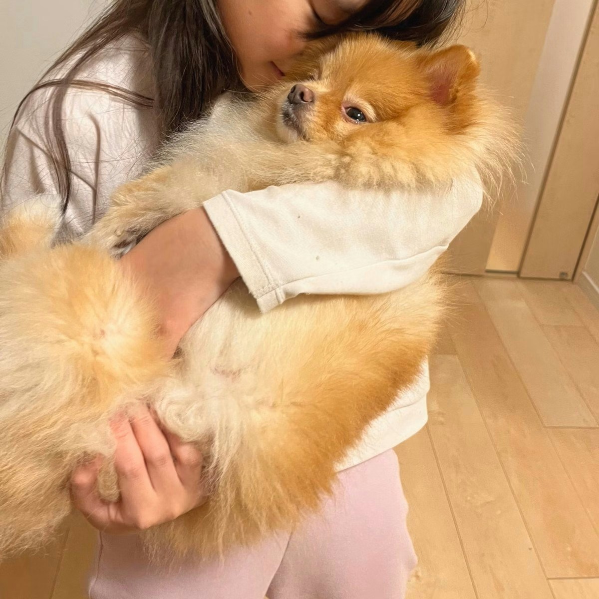 「ねぇねよろこぶから」抱っこされるポメの姿に5千いいね