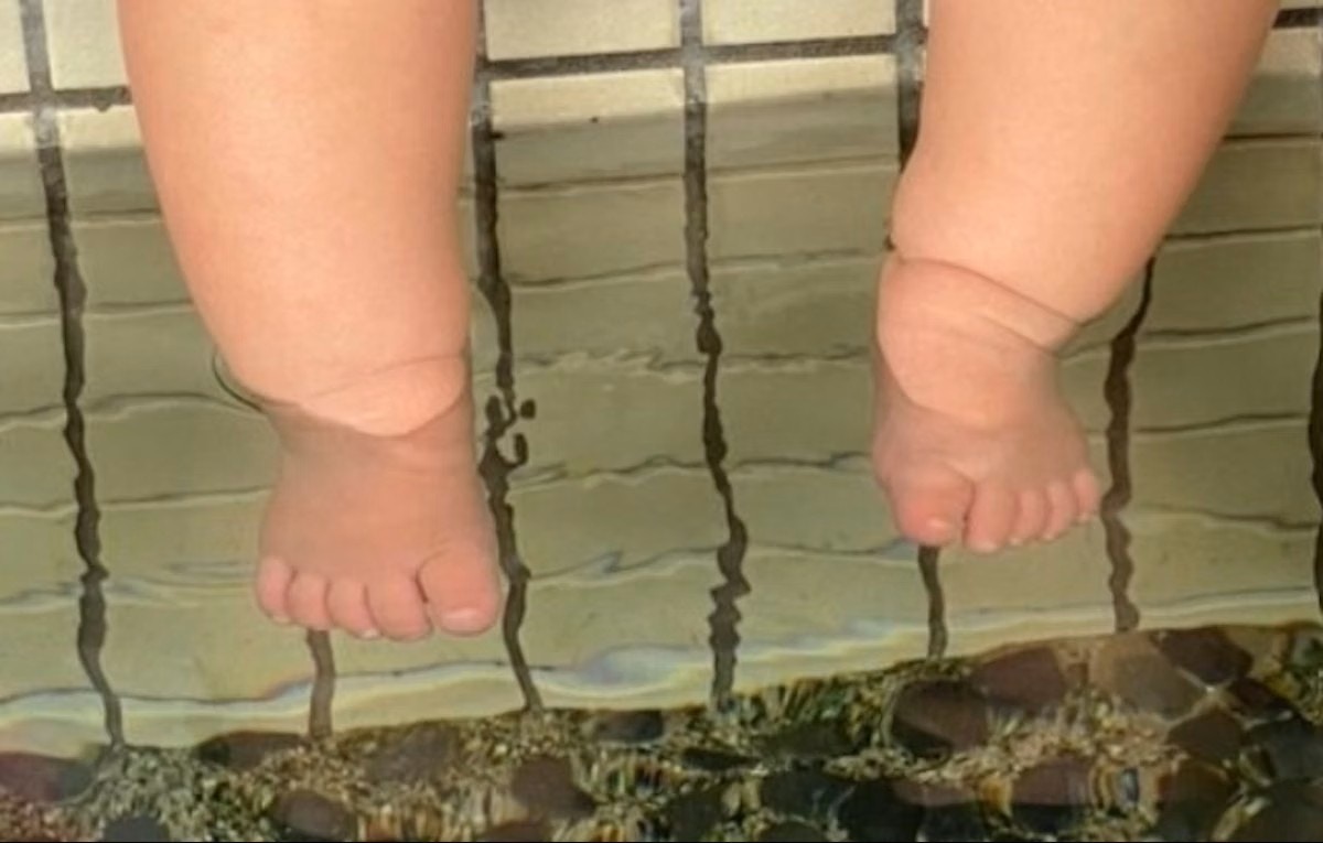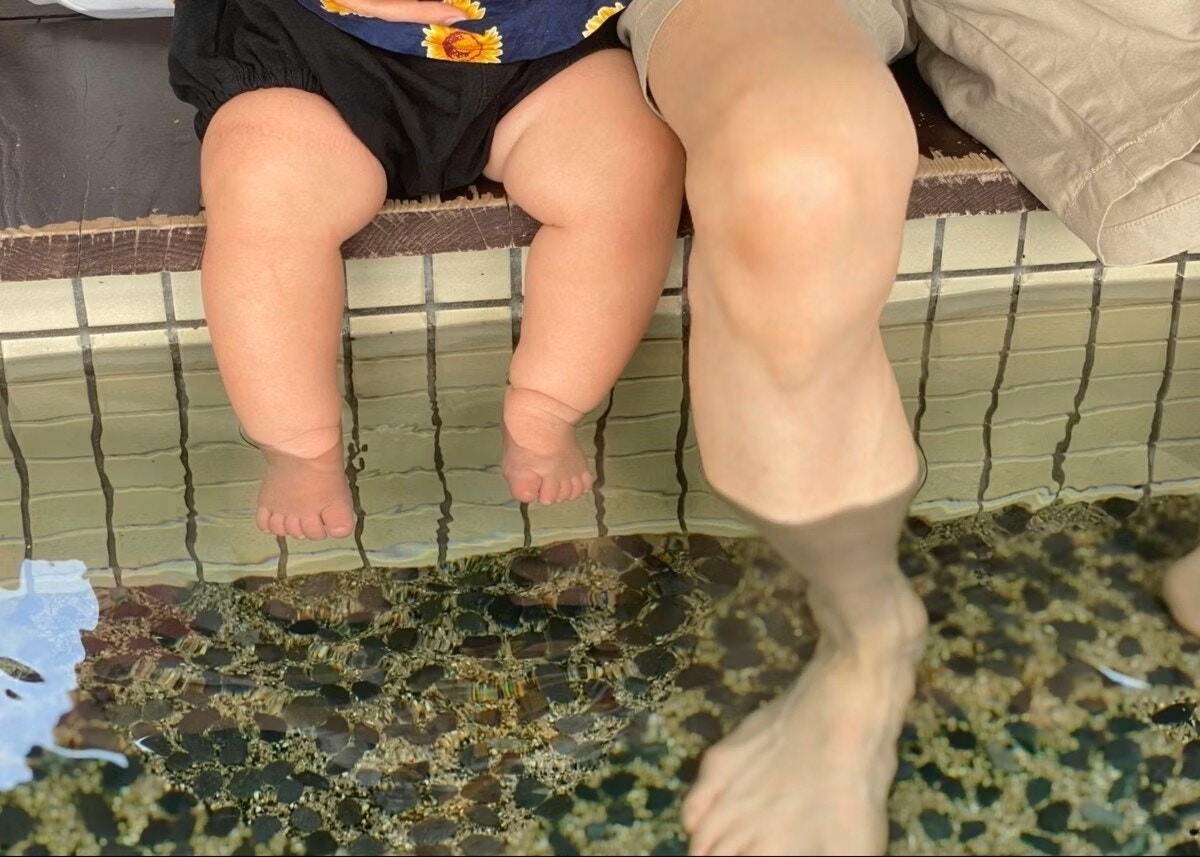 むちむちとしたあんよが足湯に浸かる姿、かわいすぎますよね。隣に座るパパとの足の長さや大きさの違いが、余計にかわいらしさを引き立てているように思えます。ちぎりパンのような太ももや足首も、この時期ならではの愛らしさです。