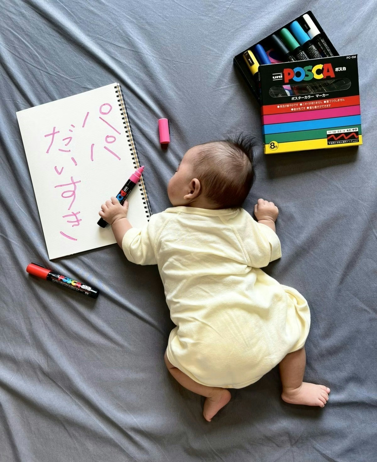 赤ちゃんが「パパだいすき」と描いたの?と思うような1枚。実際に書いたのはママのさくらいさんですが、赤ちゃんが一生懸命書いたあと、疲れて力尽きたかのように見えますね。その写真の構図が、とてもかわいらしいです。しっかりペンを握り締める小さな手も、踏ん張っているように見える足も全てが愛おしくなります。