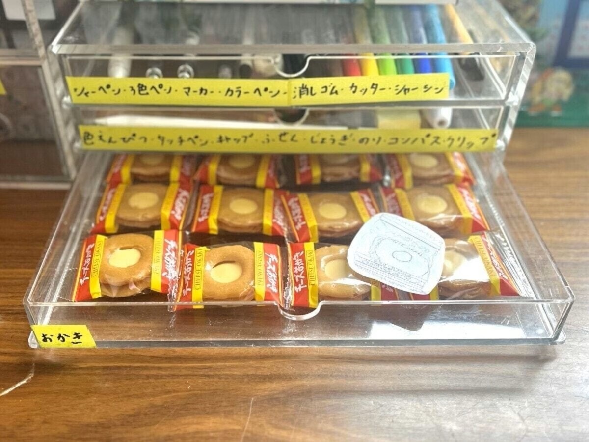 整理が好きだという息子さんは、引き出しにラベリングをして、文房具をわかりやすくきれいに収納しています。注目したいのは一番下の段。「おかき」と書かれたその段には、チーズおかきが入っています。