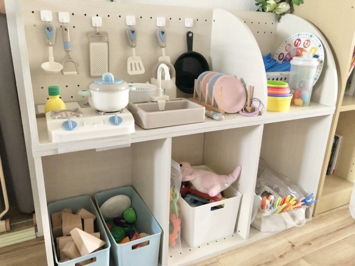 ゆに☺︎さんが作ったのは、白をベースにした手作りままごとキッチン。実はこれ、市販のキッズ用おままごとキッチンではなく、使っているのはニトリの白いカラーボックス×セリアのおままごとパーツを組み合わせて並べただけのお手軽DIYなのです!