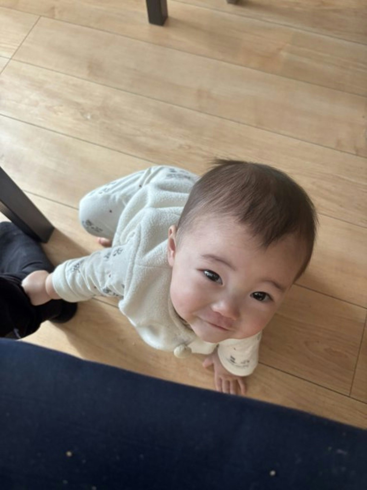 ちょっとの隙をつこうとしても、気づけばわが子はいつの間にか足元に(笑)!コーヒーは飲めなくても、この瞬間は尊い、とても大事な時間ですね。この距離感、この表情…たまらなくかわいいですね。この一瞬は、「今しかない宝物」です。