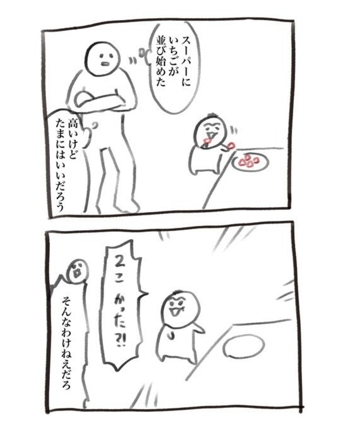 子どもはイチゴのお値段なんて知らないので「2個買った?」と一言。パパの「そんなわけねぇだろ」という間髪入れないツッコミにじわじわと笑いがこみ上げます。