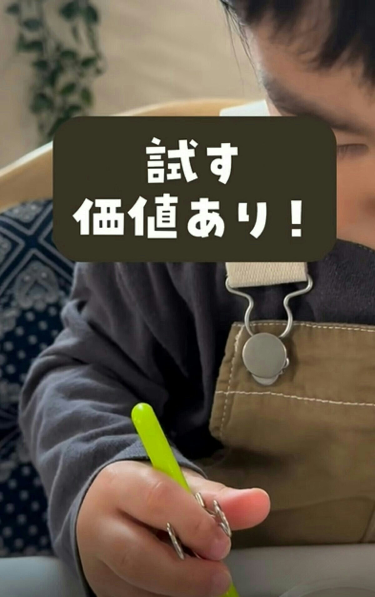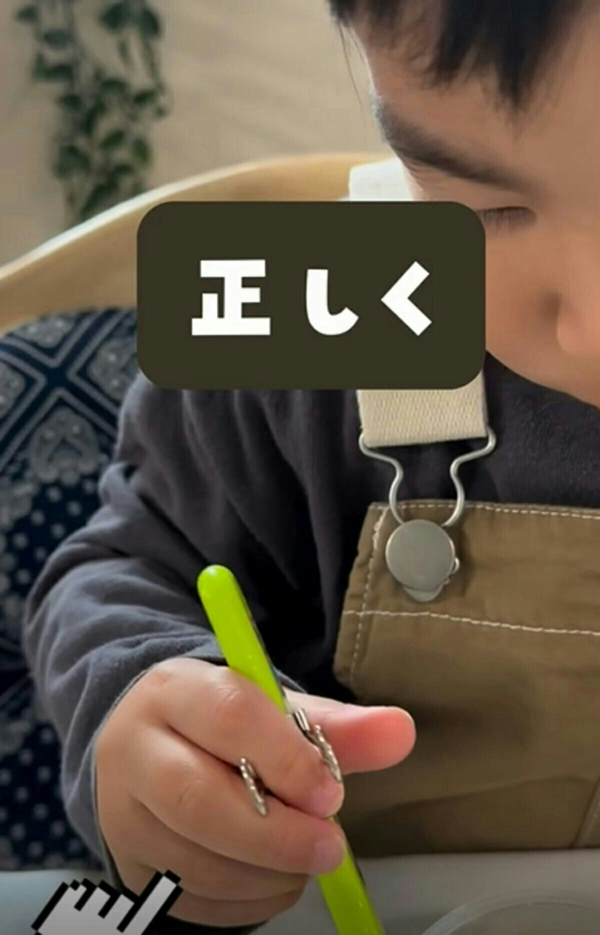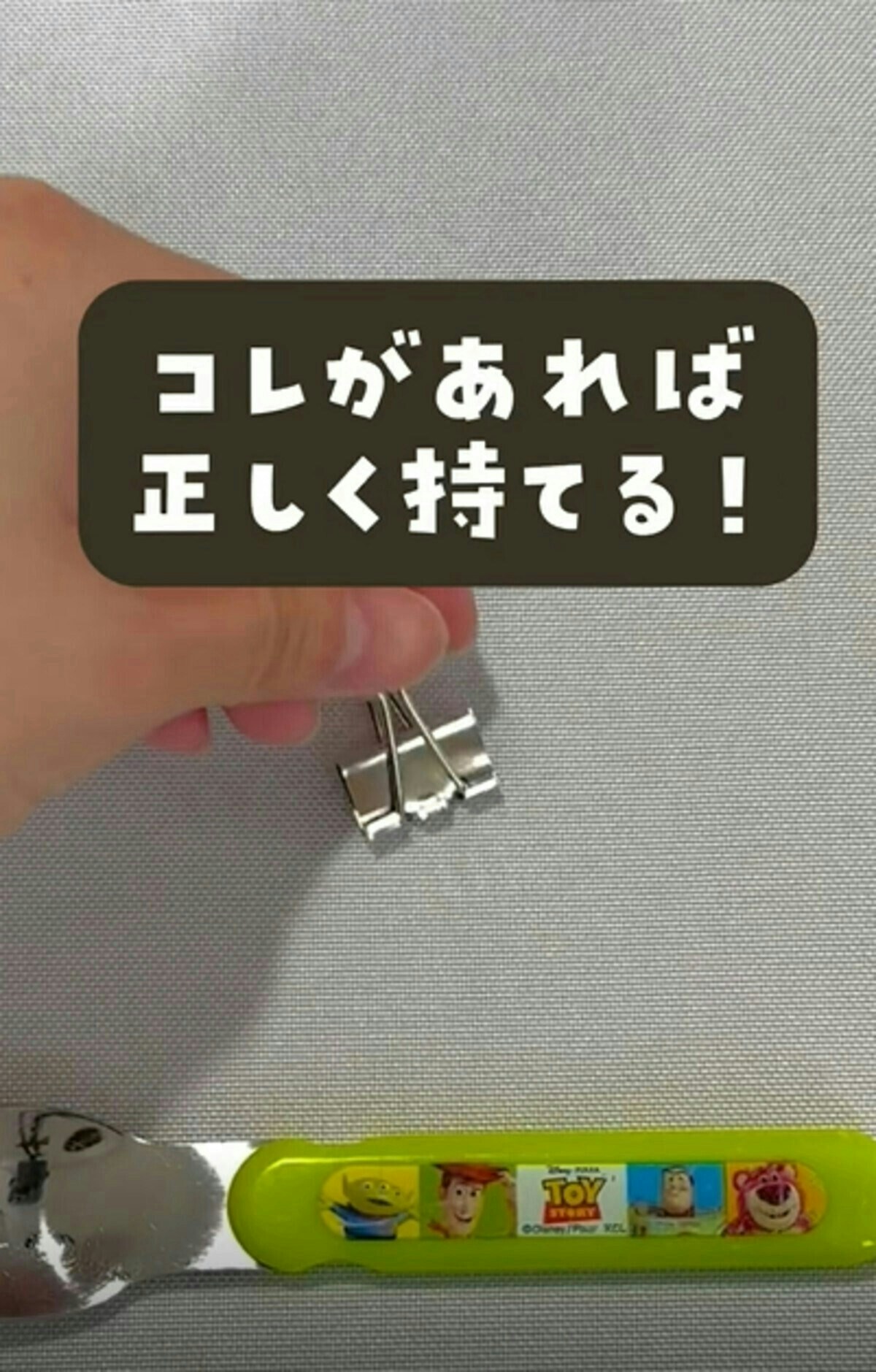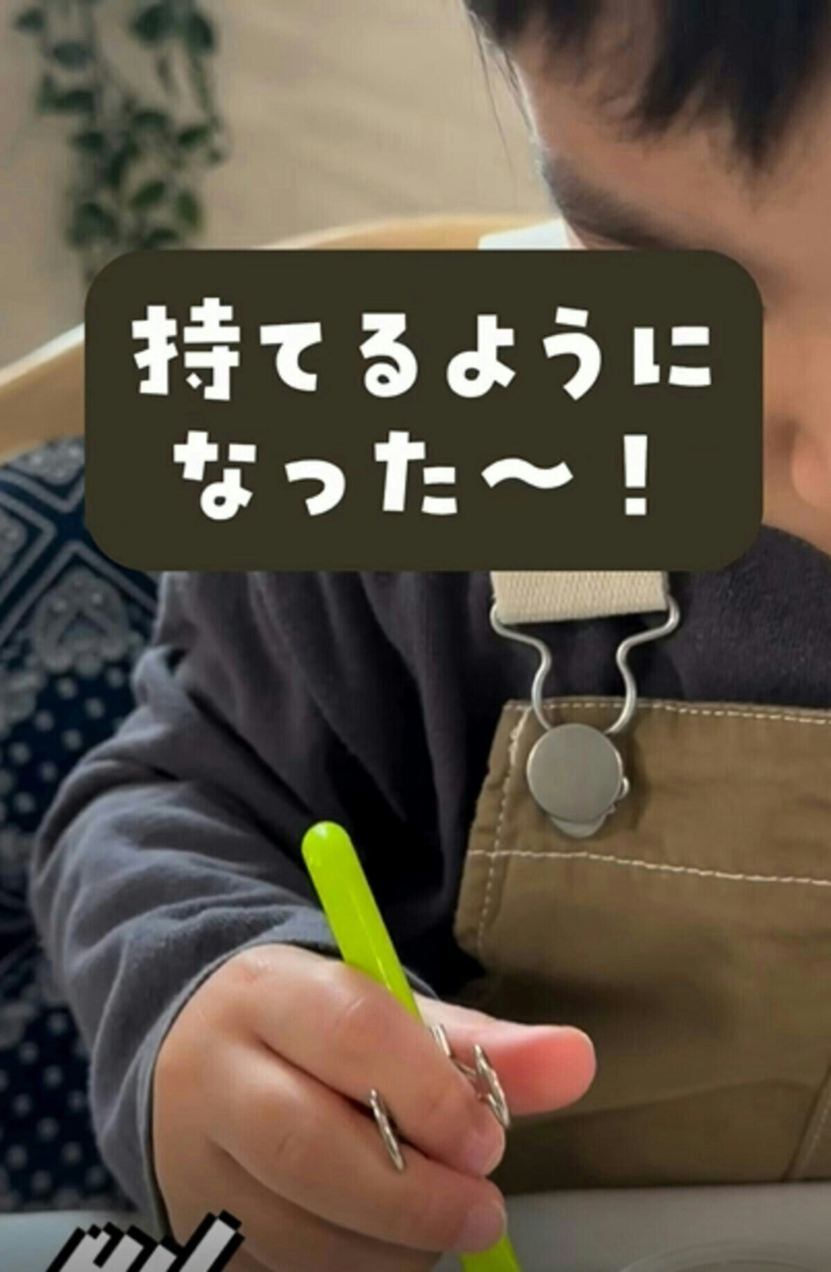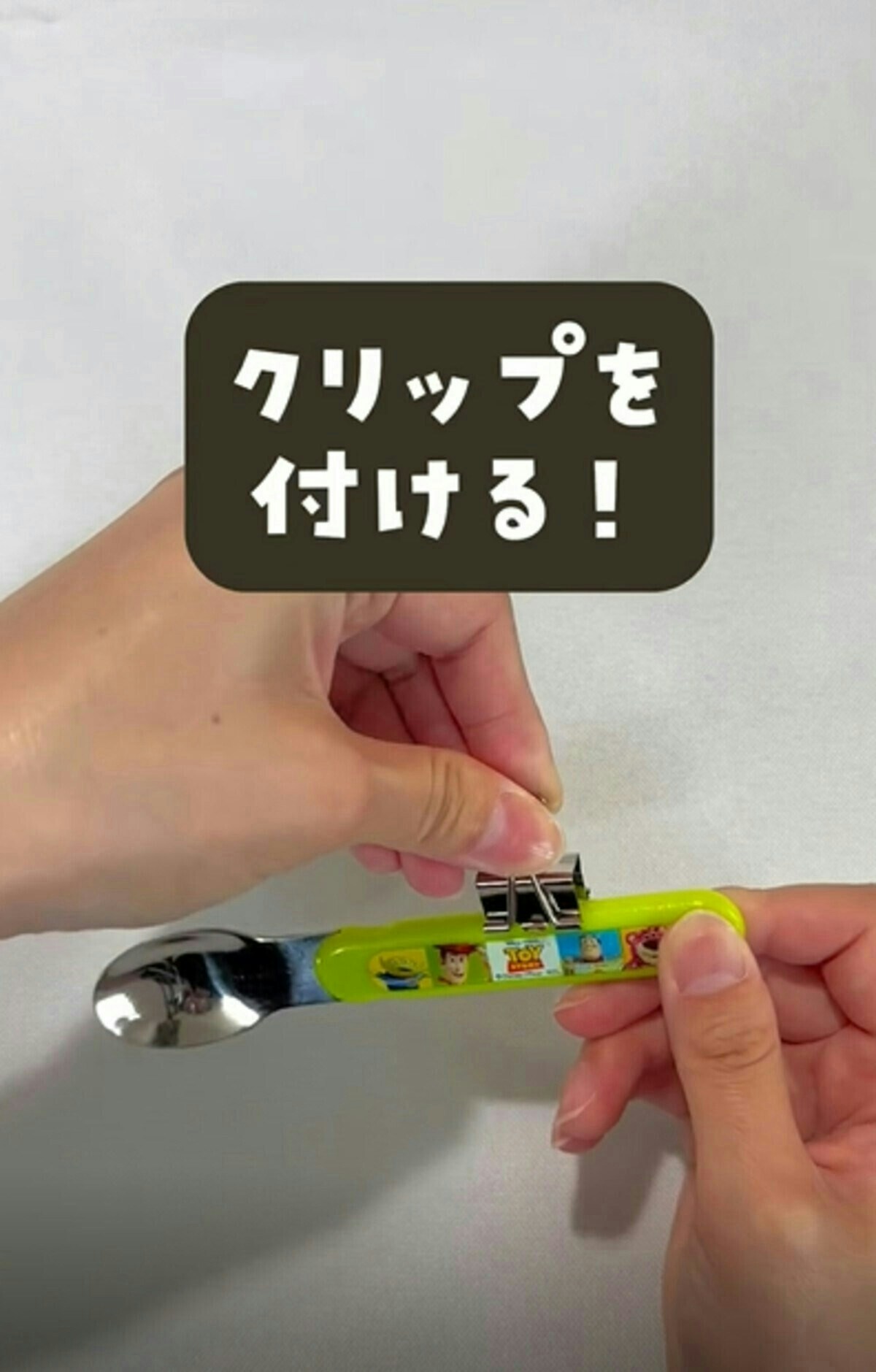 クリップの金具が支えとなり、正しい持ち方に導いてくれています。しばらくはこの状態で様子を見て、スプーンの持ち方を癖づけてあげると良いですね。