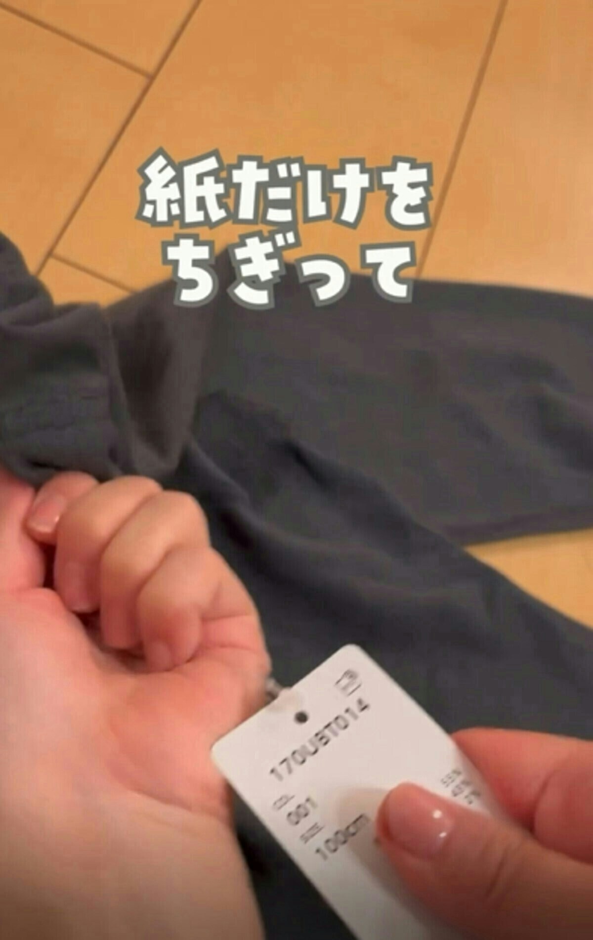タグをひもに押し当てたまま、強く引っ張ります。ゆみ|ワンオペ×ストレスフリーな育児さんによると、強めの力が必要なようなので、思いっきり引っ張りましょう。