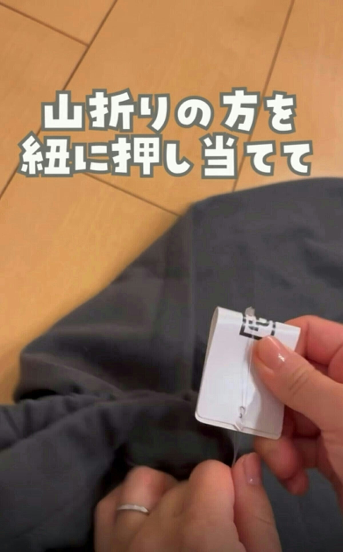 タグを山折りにした部分を、ひもに押し当てます。