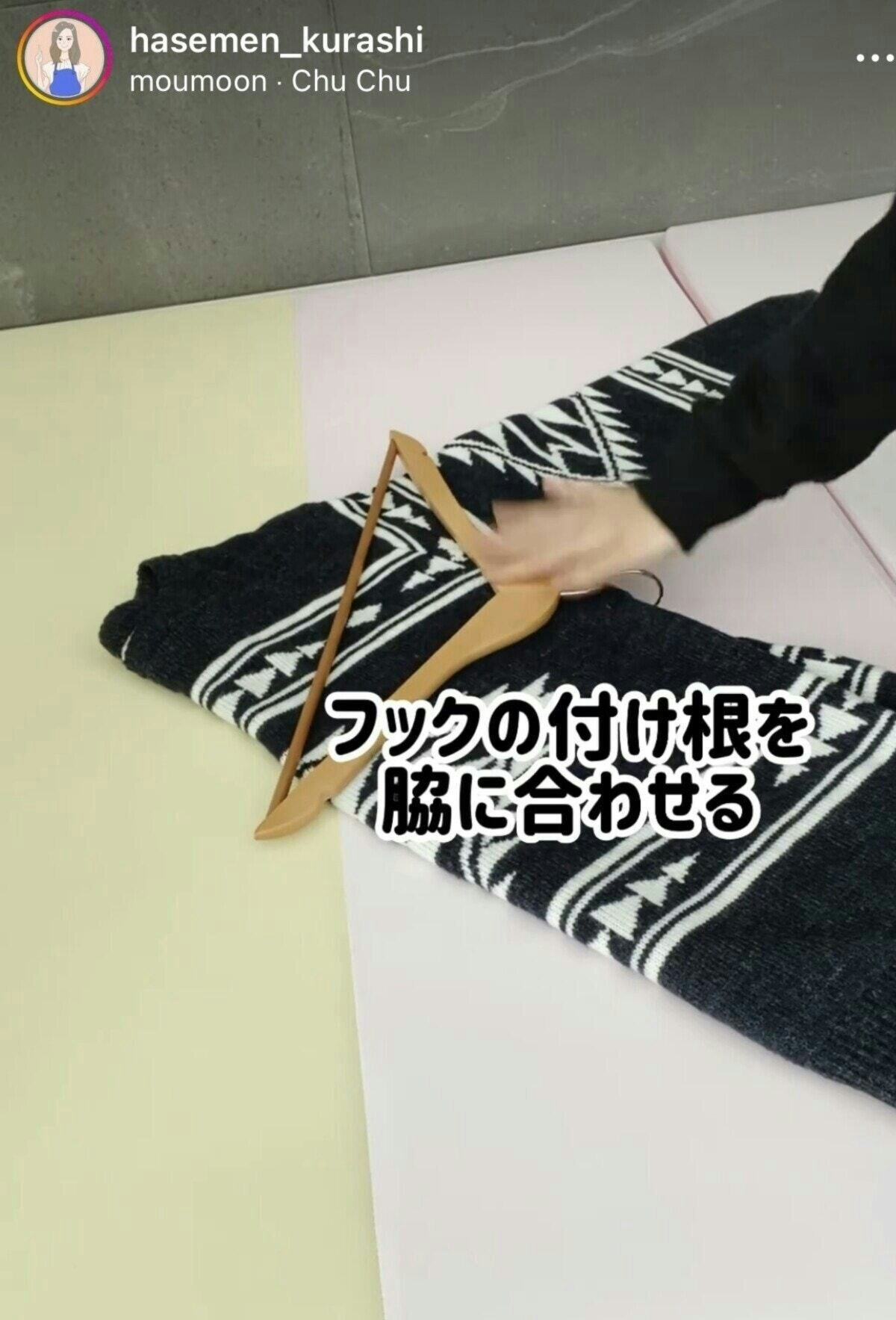 ニットの袖を、ハンガーをはさむようにして折りたたむ