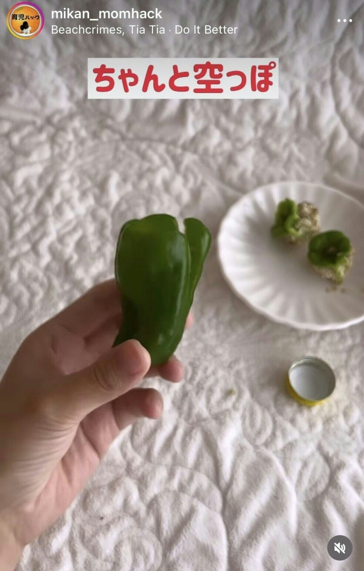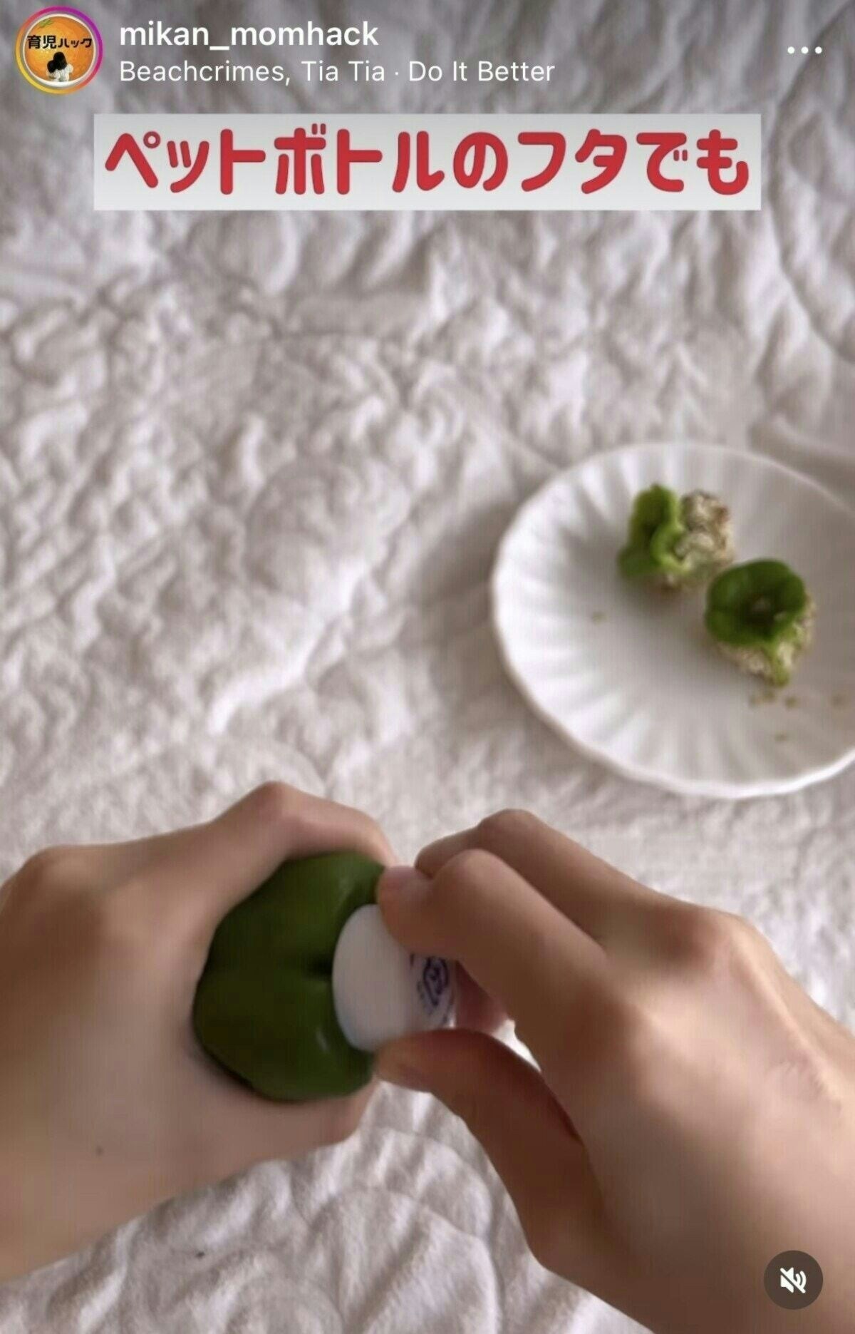 ちなみに、家に金属製のフタが無いときは、ペットボトルのフタでも代用が可能とのこと。押し当てた際、ペットボトルのフタだと、ピーマンの中に入ってしまうこともあるようです。しかし、そのフタを取り出すときれいに取り除くことができています。