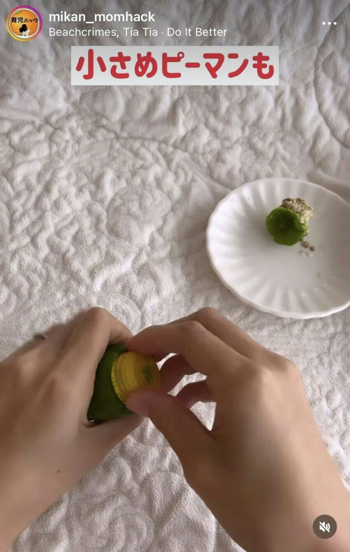 この裏技では、小さめサイズのピーマンでも同じようにヘタを取り除くことができます。