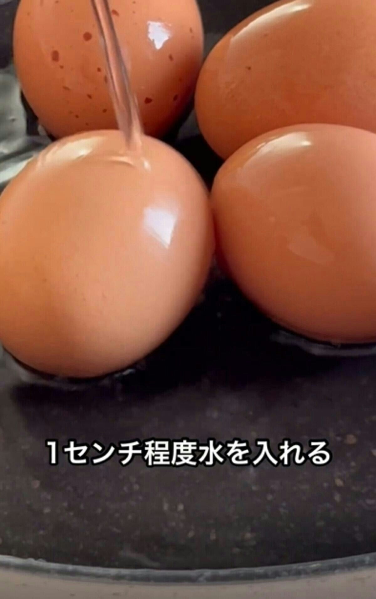 そして、卵を置いたフライパンに1㎝ほどの水を加えます。