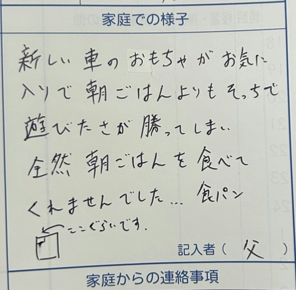 家庭での様子として、おもちゃに夢中で全然朝ごはんを食べてくれなかったと伝えたパパさん。どのくらい食べたのかを示すのに、食パンのイラストと共に「ここぐらいです」と、わかりやすく書かれています。食べてくれなかったと悲しむ気持ちも伝わってきますが、イラストがシュールでつい笑ってしまいました。