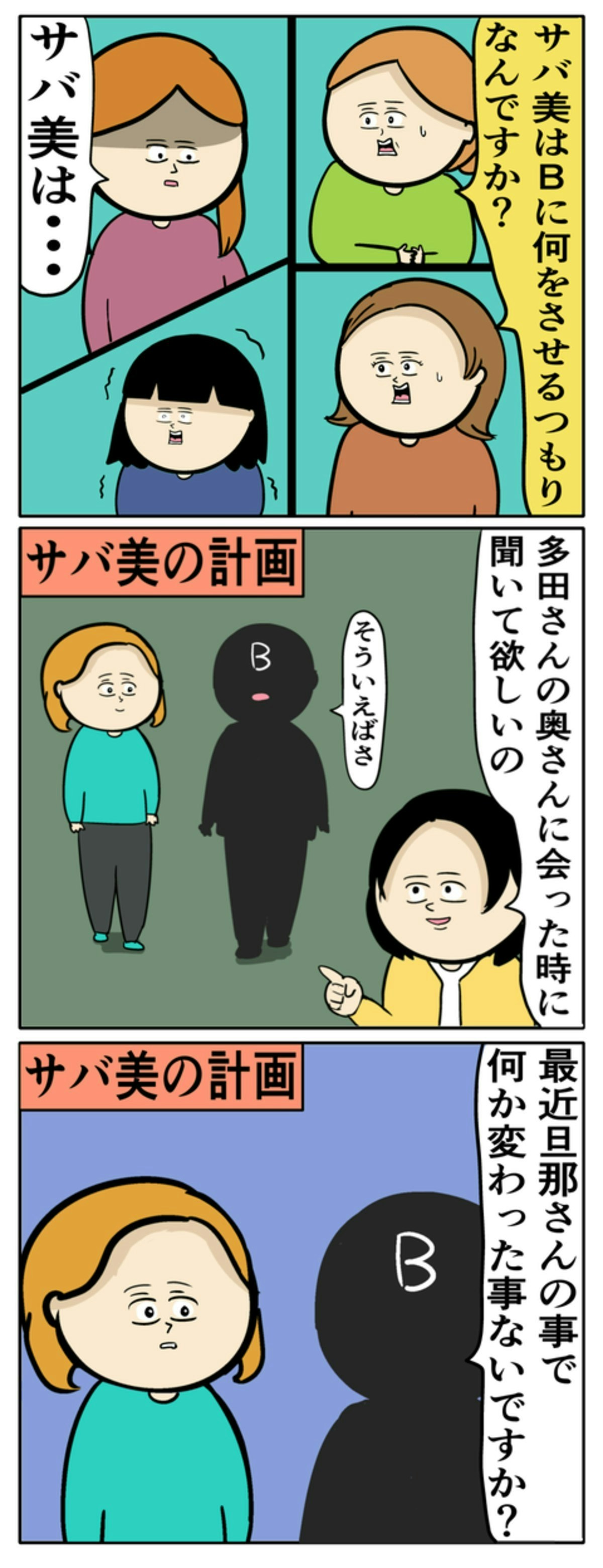 実はBは、多田さんの妻とママ友同士。Bは、専業主婦の多田さんを妬んでおり、今回のサバ美の計画に協力します。そしてサバ美は、あくまで自分は何も知らない体で、周りの気持ちを動かそうと計画。夫のことを信じていても、ママ友から度々よくない噂話を聞かされるのは傷つきますよね。