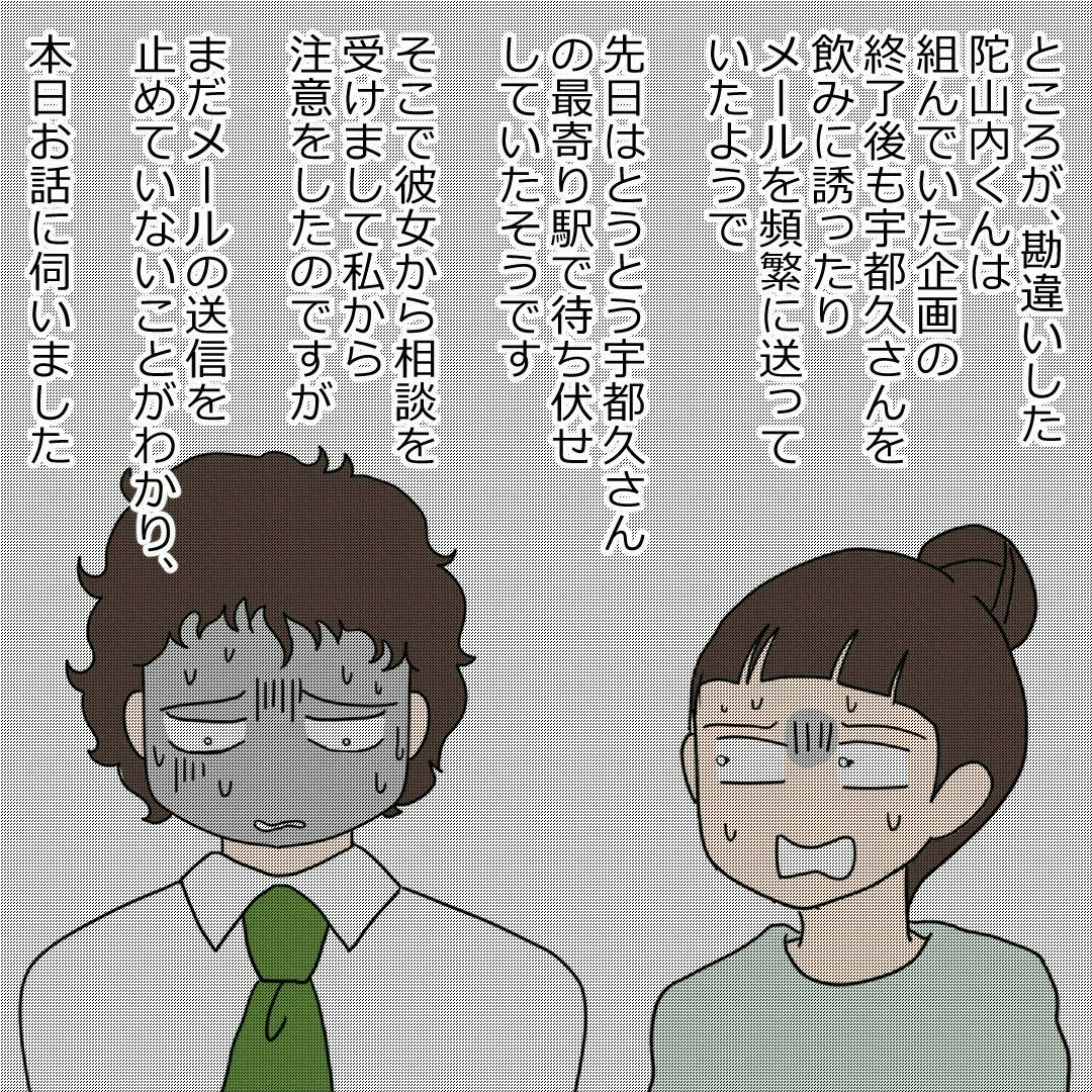 ある日突然、ウル実さんの自宅に夫の職場の人が訪ねてきて、衝撃的な事実を聞かされました。まさか、夫が職場の女性にストーカー行為をしていたなんて、まったく予想もしていませんでした。これは、ショックですね…。