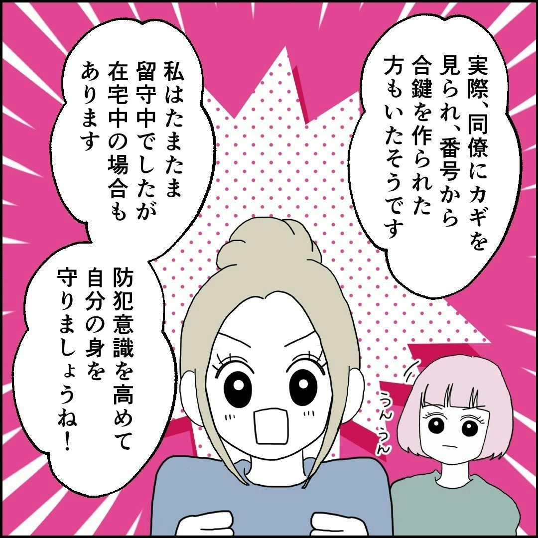 「同棲しているような気分になれた」という供述、ゾッとしますね…。今回、レイは犯人と鉢合わせすることはありませんでしたが、遭遇してしまうケースもあります。もしも、違和感を察知したら、すぐに避難することが大切ですね。